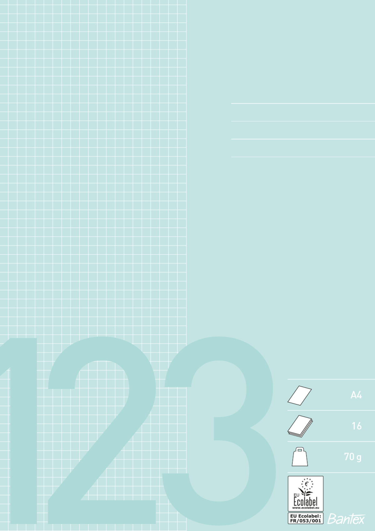 Skolhäfte i 70 g papper. A4-format. Linjeringsdetaljer: rutor 5x5 mm. 16 blad.
