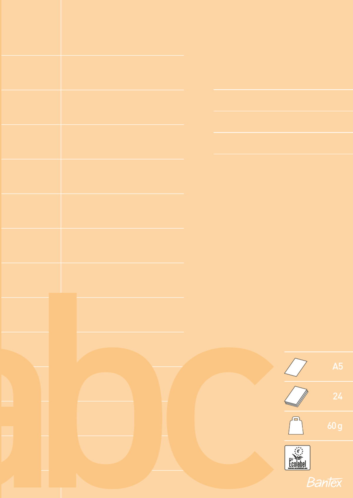 Skolhäfte i 60 g papper. A5-format. Linjeringsdetaljer: 14,5 mm / 13 linjer. 24 blad.