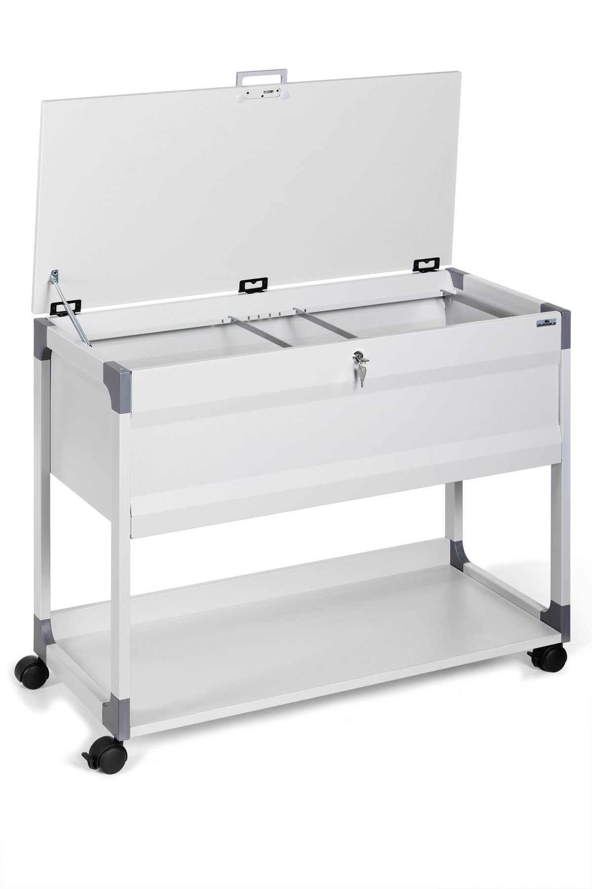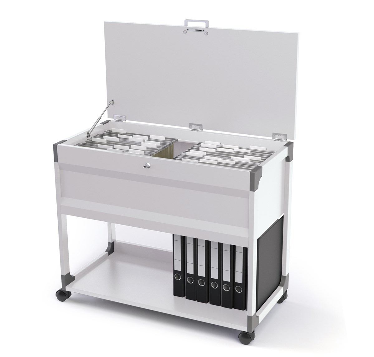 Låsbart hängmappsställ för alla vanliga format som A4, folio eller foolscap. Rymmer ca 100 hängmappar eller ca 10 hängpärmar (ryggbredd ca 80 mm) respektive ca 18 hängpärmar (ryggbredd ca 40 mm) i A4-format. Stabil ram av repsäkert stål med glasfiberförstärkta plasthörn. Slitstark bottenplatta (19 mm) med tippskydd för förvaring av t.ex. pärmar. När locket öppnas stannar det i en vinkel på 90°. 4 hjul, varav 2 med broms. Levereras omonterad med monteringsinstruktion. BxHxD: 897x736x432 mm.