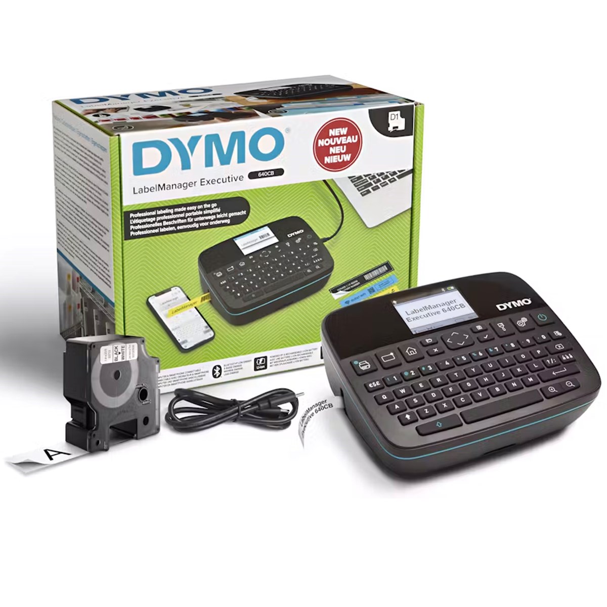 Upplev bekvämligheten med märkning när du är på språng med LabelManager® Executive 640 CB. Dess laddningsbara litiumjonbatteri och kompakta design gör den perfekt för mångsidig användning. Det strukturerade greppet säkerställer bekväm hantering, medan den högupplösta skärmen erbjuder oöverträffad läsbarhet och avancerade tillgänglighetsfunktioner för enkelt skapande av etiketter.