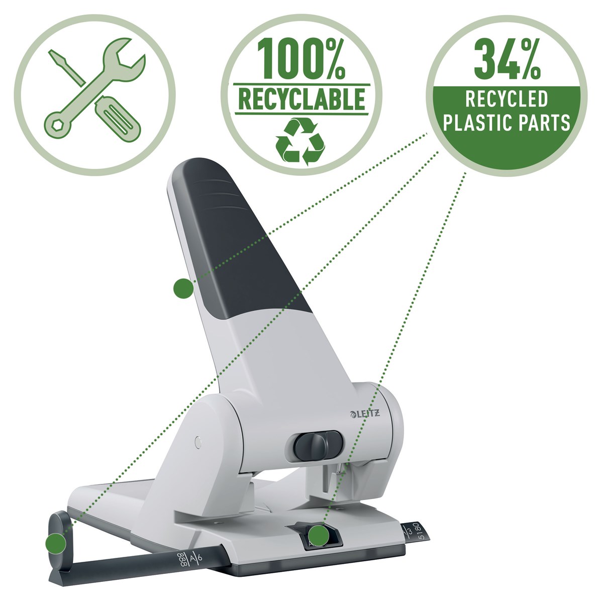 I slutet av sin livstid är den 100% återvinningsbar när den är helt demonterad i de olika materialtyperna för att minska avfallet och bidra till att bevara jordens resurser. Leitz 5180 Heavy Duty hålslag omfattas av en 10-årsgaranti och är GS-säkerhetstestad.