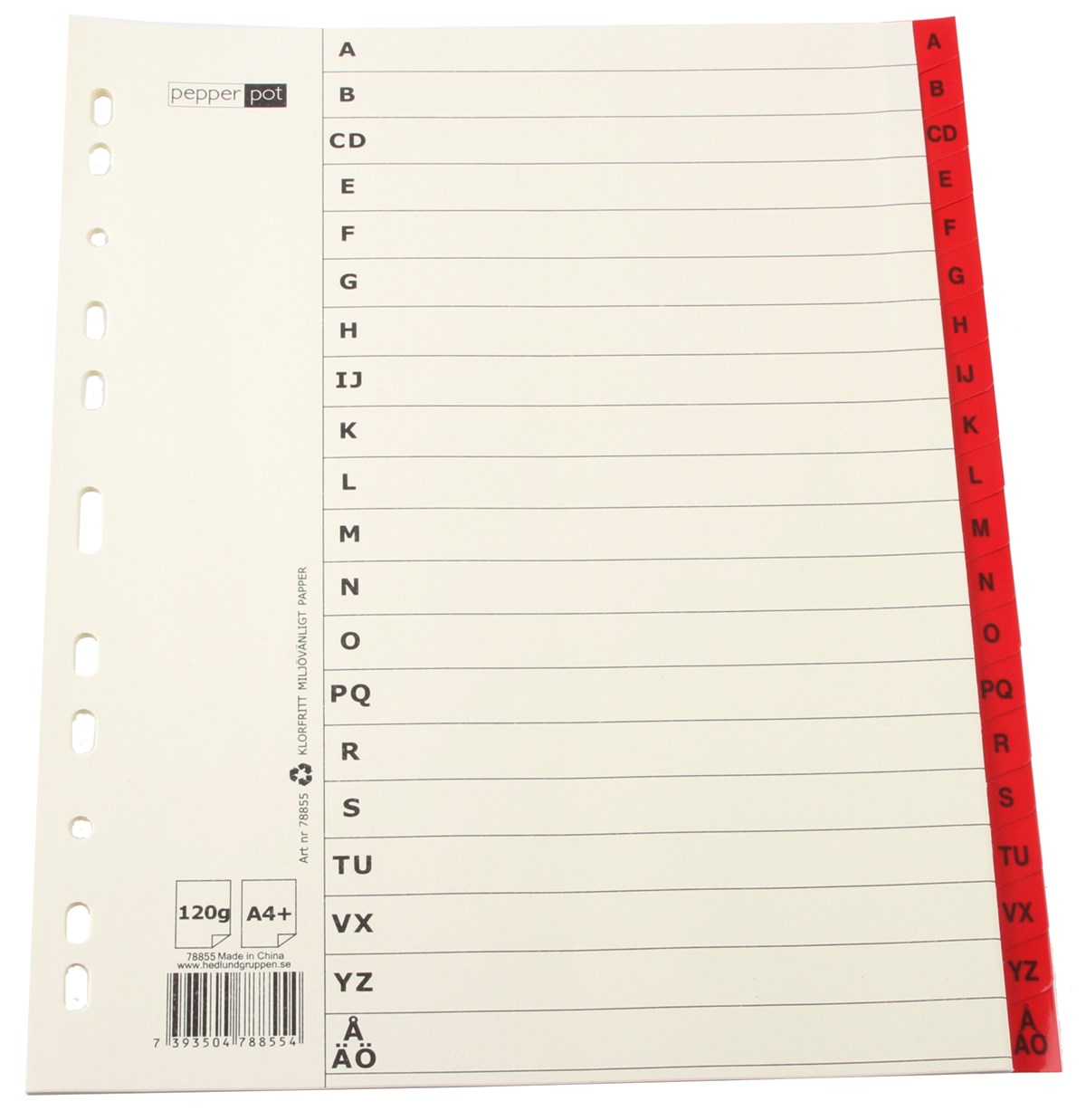 Extra breda register som kan användas tillsammans med underregister och plastfickor. Plastförstärkta flikar. 110 g papper. Multihålade. Mått: 233 x 298 mm. Påsförpackade.