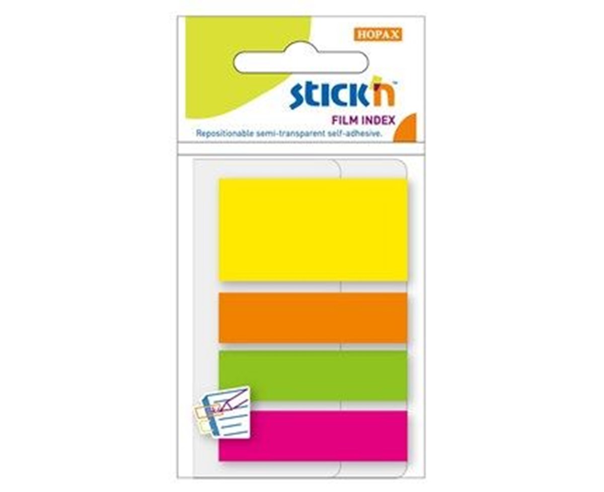 Självhäftande indexflikar som lätt fästes på papper eller annat som vi vill hitta snabbt. 45 flikar per färg. Tre block i format 45x12 mm (orange, grönt och rosa) samt ett block i format 45x25 mm (gult). Alla halvtransparenta neonfärger.