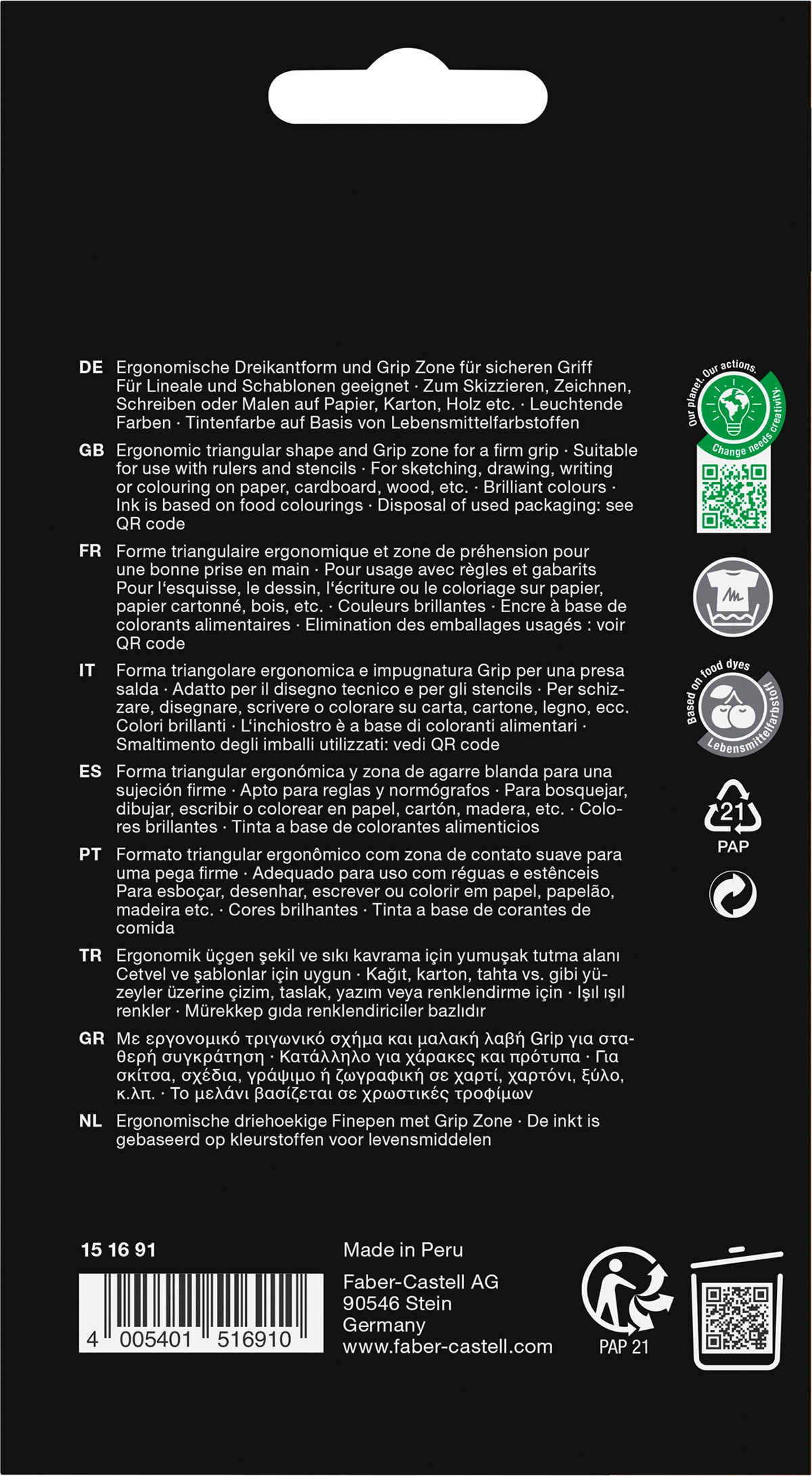 En fineliner av högsta kvalité. Ergonomisk trekantig pennkropp och Grip-zone för en halkfri och trygg användning. Lika bra för både höger- som för vänsterhänta. Lång,fin metallförstärkt fiberspets i 0.4 mm perfekt vid användning av linjaler och schablonmallar. Idealisk för tunna linjer och skuggor samt detaljerat tecknande. Kan enkelt tvättas bort från de flesta textiler. Pennorna är gjorda av minst 56% återvunnen plast. Förpackningen av 100% återvunnen papp, innehåller 10 st finelinerpennor i de fyra basfärgerna; svart, röd, blå och grön