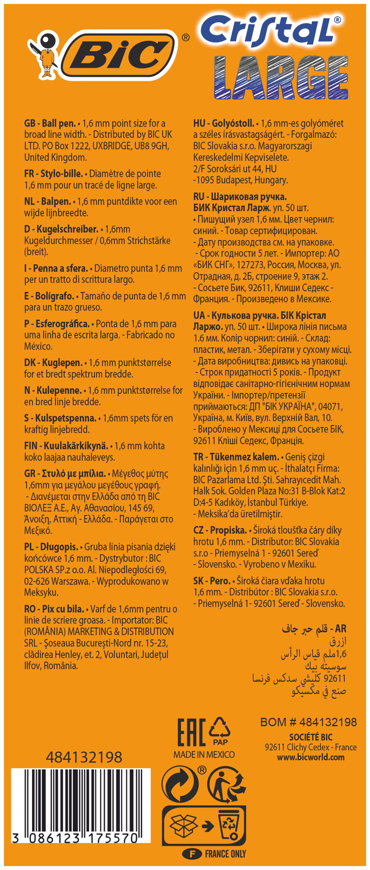 Genom årens lopp har den första BIC-pennans karakteristiska design gjort den till en klassiker. BIC Cristal-pennan och dess stora familj – Fine, Fun, Grip, Original, Soft och Large – täcker allas skrivbehov. BIC Cristal Large-pennan har en 1,6 mm bred spets för linjer som är ännu jämnare och mörkare. Den här slitstarka kulspetspennan är perfekt för långa skrivuppgifter och snabba anteckningar. Den fungerar lika bra för att rita samt lösa korsord och sudoku – både svåra och lätta. En vägledande princip hos BIC har alltid varit att hitta den perfekta balansen mellan funktion och design, så den BIC Cristal Large-pennan har en röktonad, sexkantig pennkropp så att du kan kontrollera bläcknivån. Klassiska BIC Cristal-pennan kommer även med en 1,6 mm bred spets för extra läsbarhet. Den välutformade kulan ger ett jämnt bläckflöde så skrivandet blir ett rent nöje. Korken och ändpluggen matchar färgen på bläcket så du snabbt hittar rätt färg.