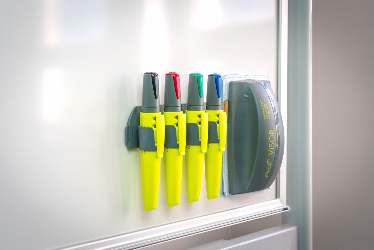 Pica Visor whiteboard set "Starter". 4 st Pica Visor whiteboardpennor (röd/grön/blå/svart). 1 torkare med mikrofiberdyna. 1 stor torkduk. 2 magnetiska hållare för totalt 4 pennor. whiteboardpennor i de universella färgerna röd, grön, blå & svart. Med ergonomisk professionell torkare: Ta bort märken torrt och utan att lämna några rester. Med stor mikrofiberduk för rengöring av stora ytor. Tvätta helt enkelt mikrofiberkudden & mikrofiberduk under kallt vatten.