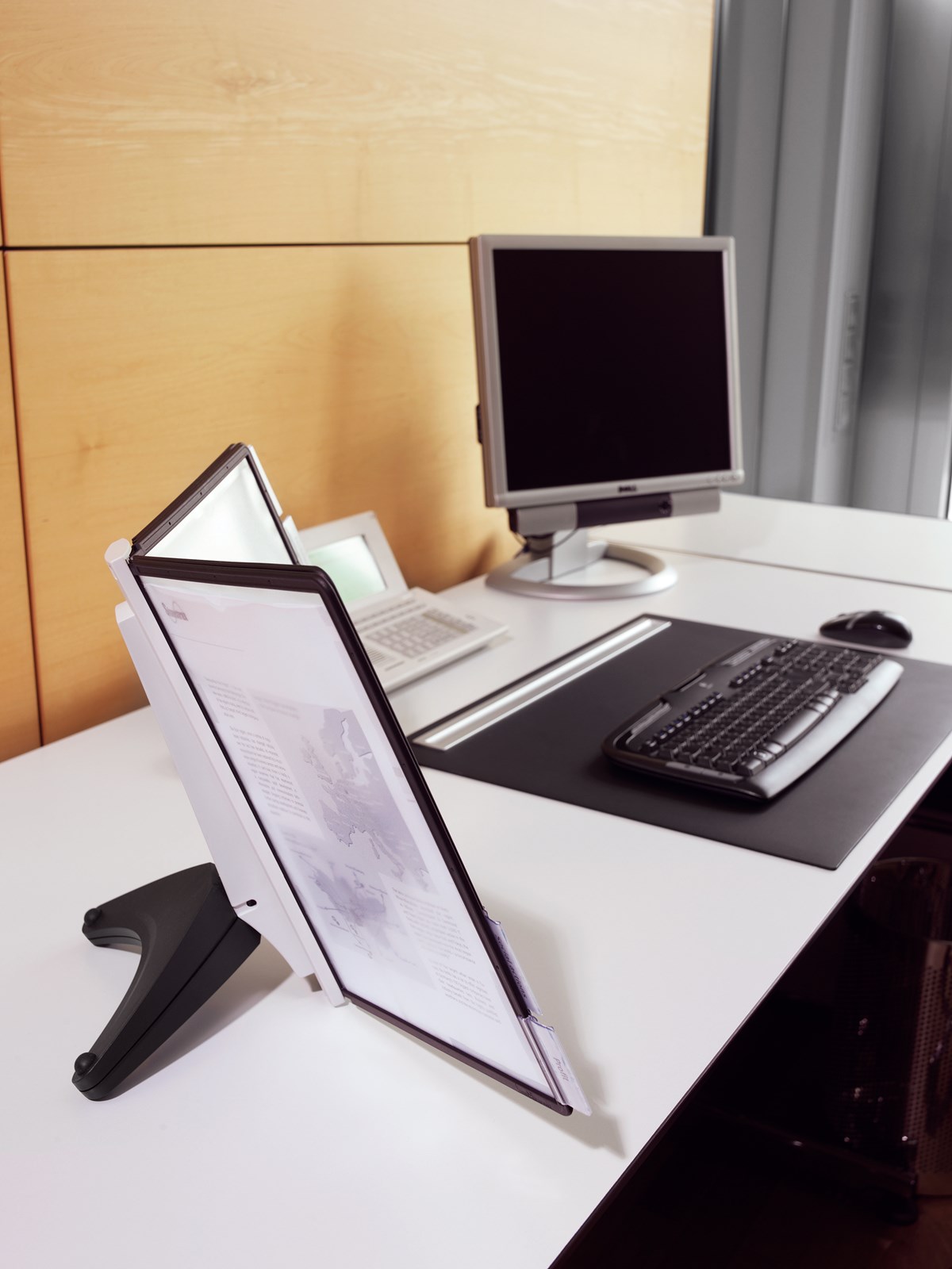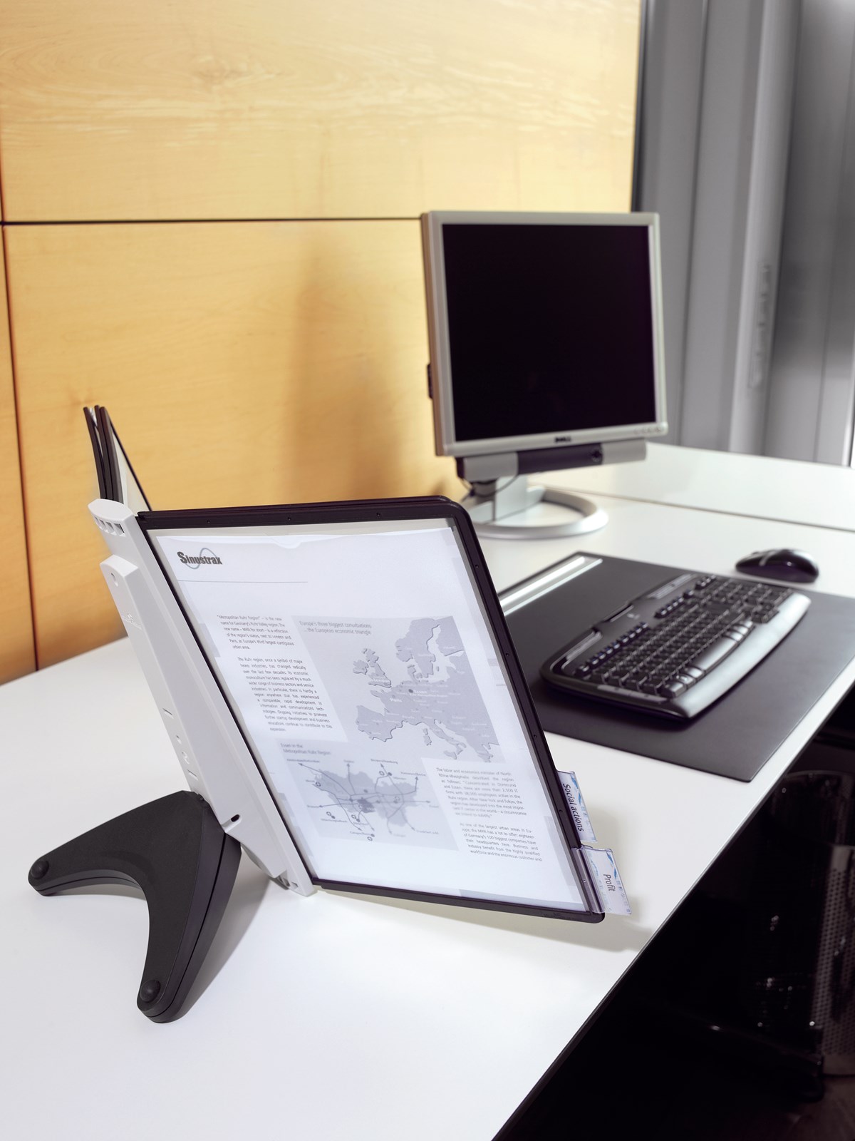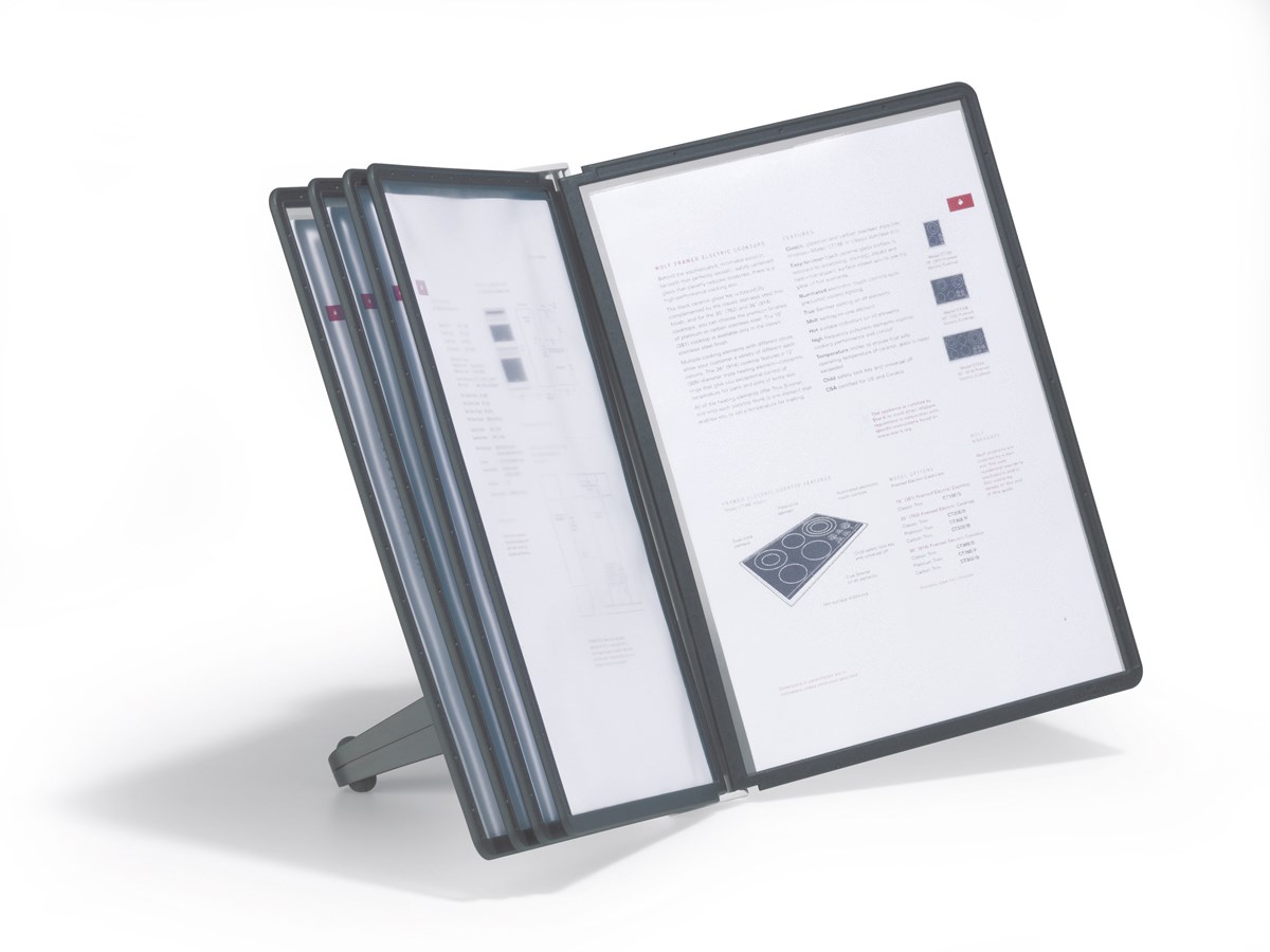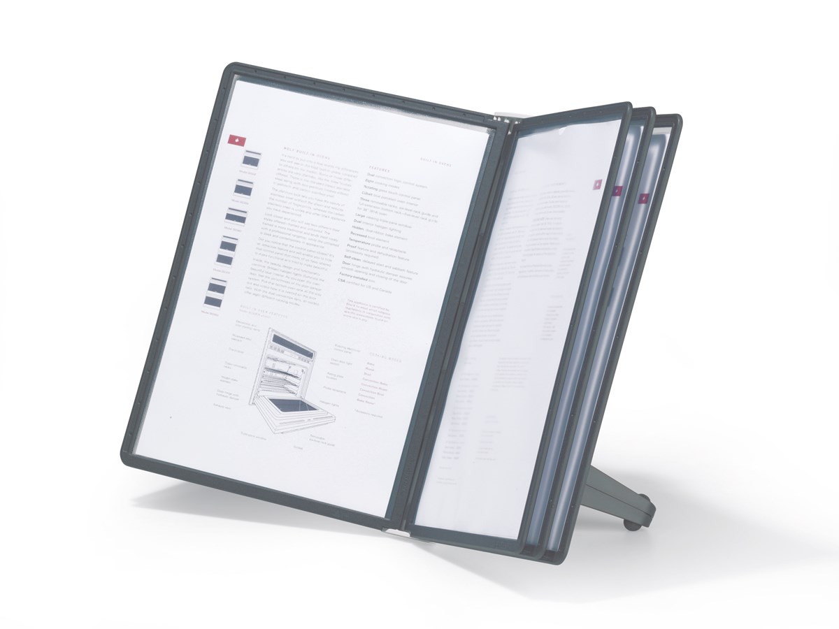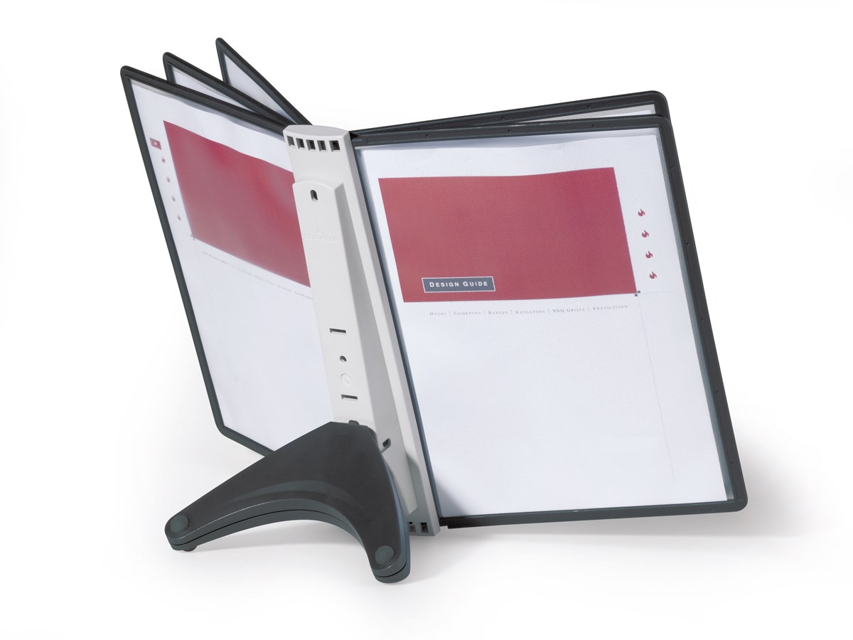 Platsbesparande bordsställ med 5 svarta paneler för A4 i polypropylenplast. Utmärkt för det lilla kontoret eller hemmakontoret. Smidig och funktionell design. 5 års garanti.