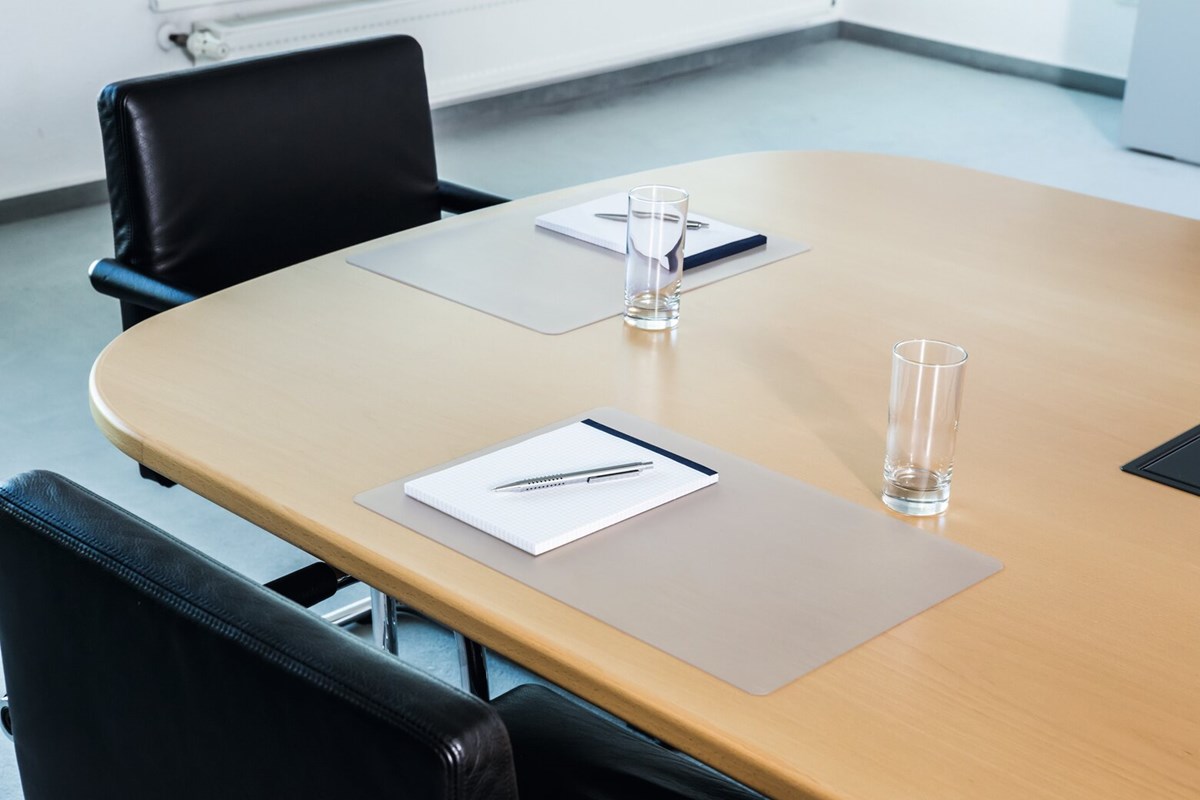 Halvtransparent skrivunderlägg i mindre format med antireflekterande yta, rundade hörn och präglad dekorkant. Passar utmärkt för konferens- och mötesrum. Ger en mjuk och skön skrivkänsla. Tack vare en tillverkningsmetod, som gör att undersidans yta får bra grepp, ligger underlägget stadigt på bordet utan att glida. Kan torkas av med en fuktig trasa på båda sidorna. Tillverkad av polyproylen och 100% återvinningsbar. Mått: 42 x 30 cm (B x H).