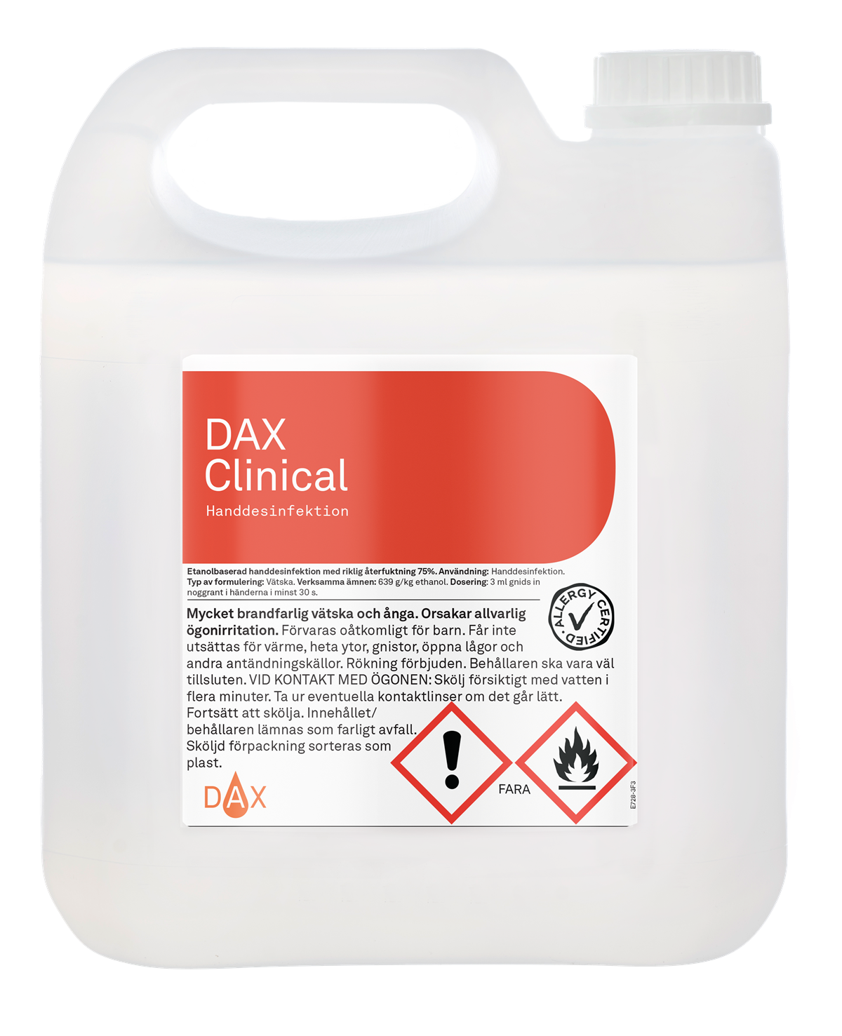 DAX Clinical Handdesinfektion är en hygienisk, flytande handdesinfektion som är utprovad i samarbete med svensk sjukvård. Produkten är etanolbaserad och effektiv mot bakterier, jästsvamp, mykobakterier och många typer av virus som t.ex. Coronavirus, Adenovirus och Murine Norovirus. Innehåller två återfuktande ingredienser.