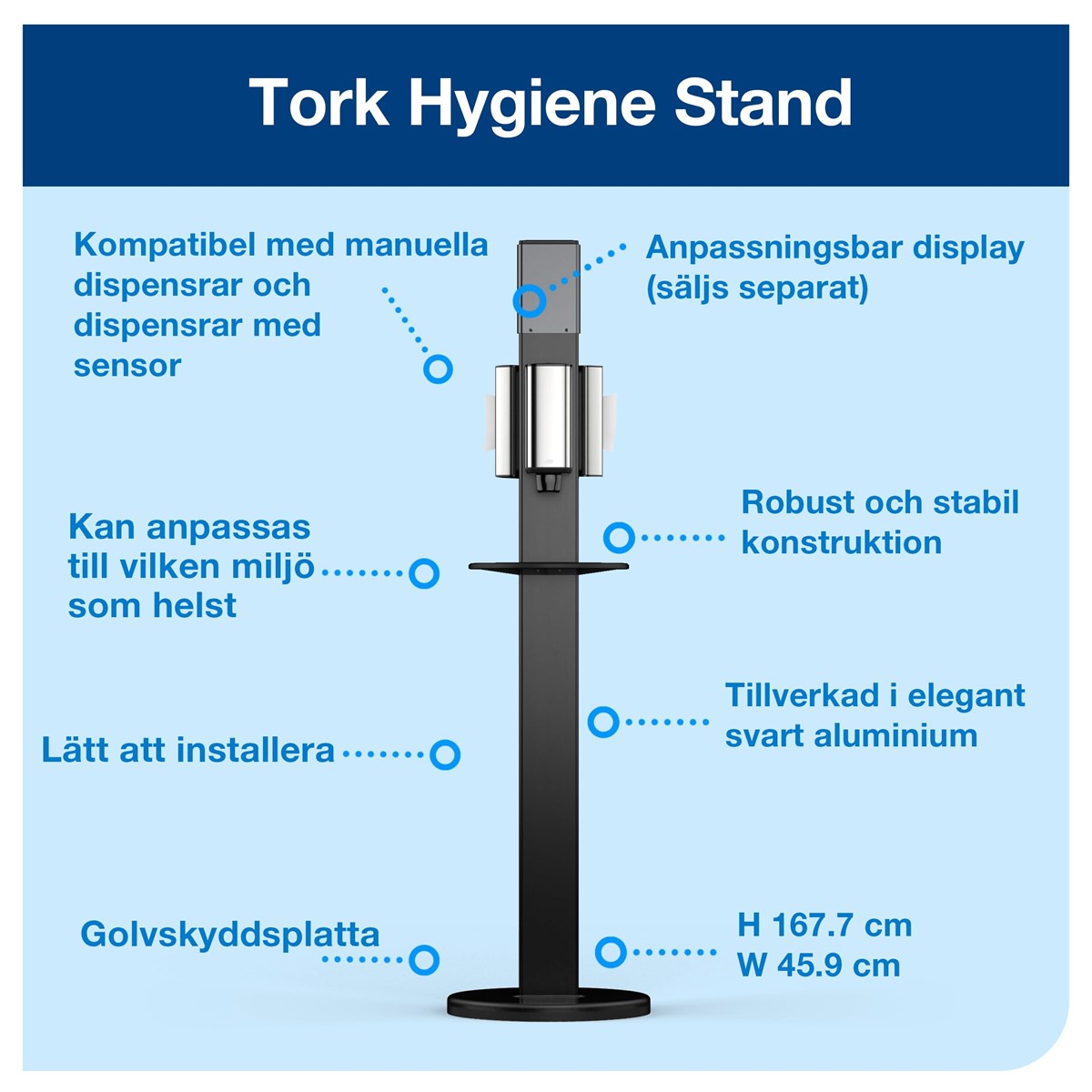 Stabilt golvställ som hjälper till att förbättra hygienen för anställda, gäster och besökare genom att ha handdesinfektion och servetter nära till hands. Plats för tre dispensrar. Passar Tork hållare S1, S2, S4 och F1. Mått ställ: 167,6 x 47 cm. Informationsfönster som träs på toppen med plats för ditt eget budskap finns som tillbehör.
