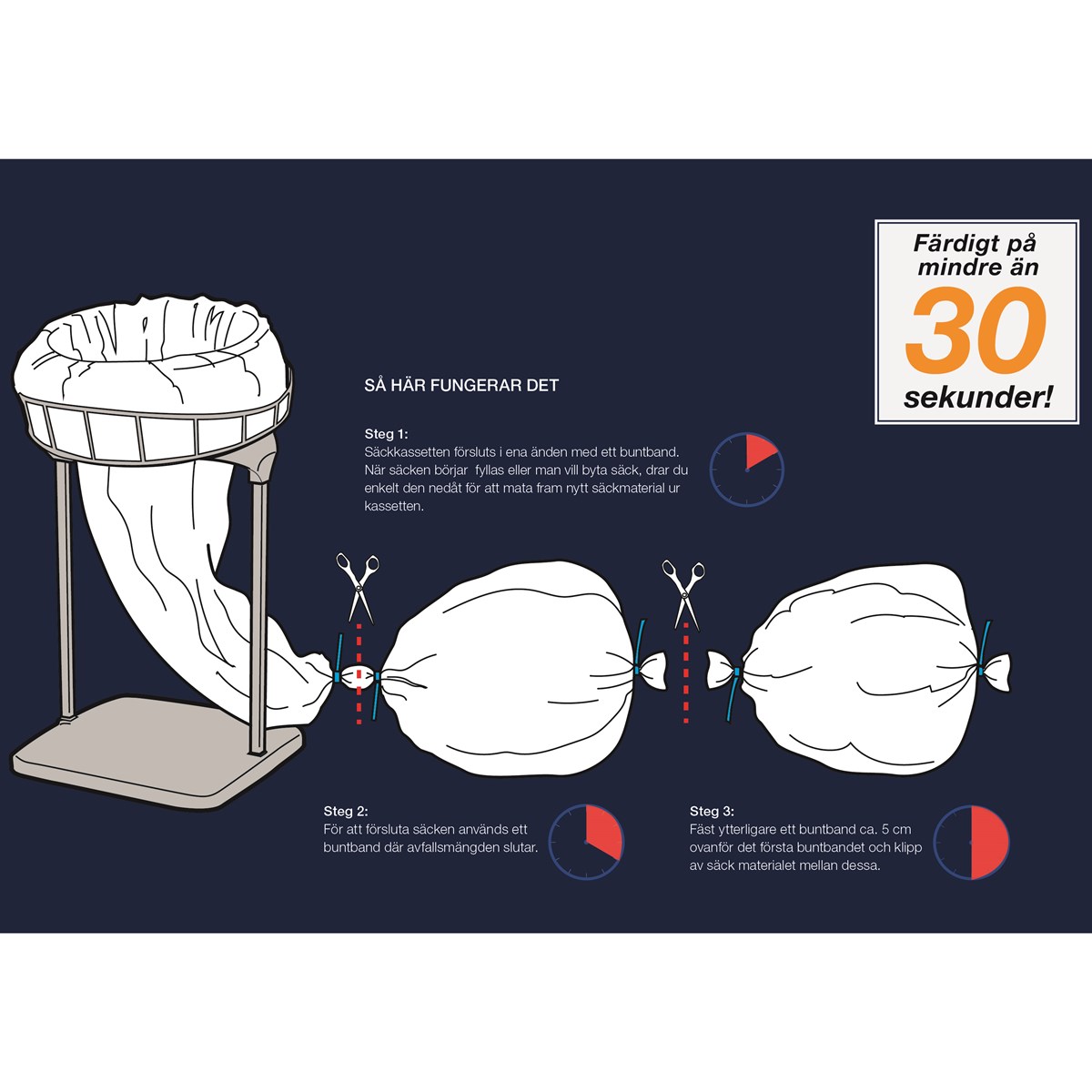 Longopac säckkassett är hygienisk och smart då byte och förslutning av säck sker från säckens utsida, vilket gör att användaren undviker kontakt med avfallet. Säckkassetten är tillverkad i 3-skikts polyeten vilket ger en låg åtgång på råvaror och hög styrka. 60 m lång säckslang. Clips för förslutning av säcken medföljer.