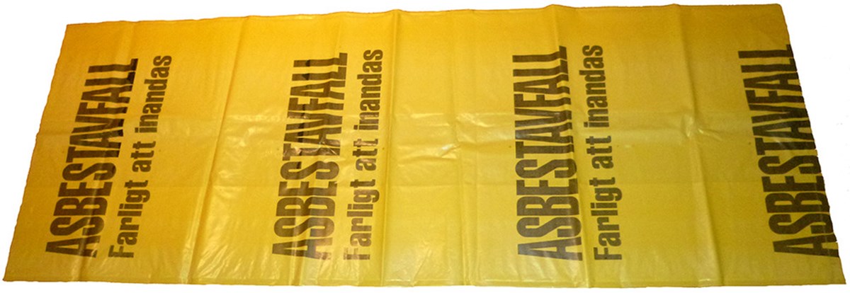 Industrisäck dubbelextruderad polyeten. Säcken är mycket stark och seg. Gul/vit med tryck ASBETSAVFALL i svart. Mått: 870x1400 mm, 90 my.