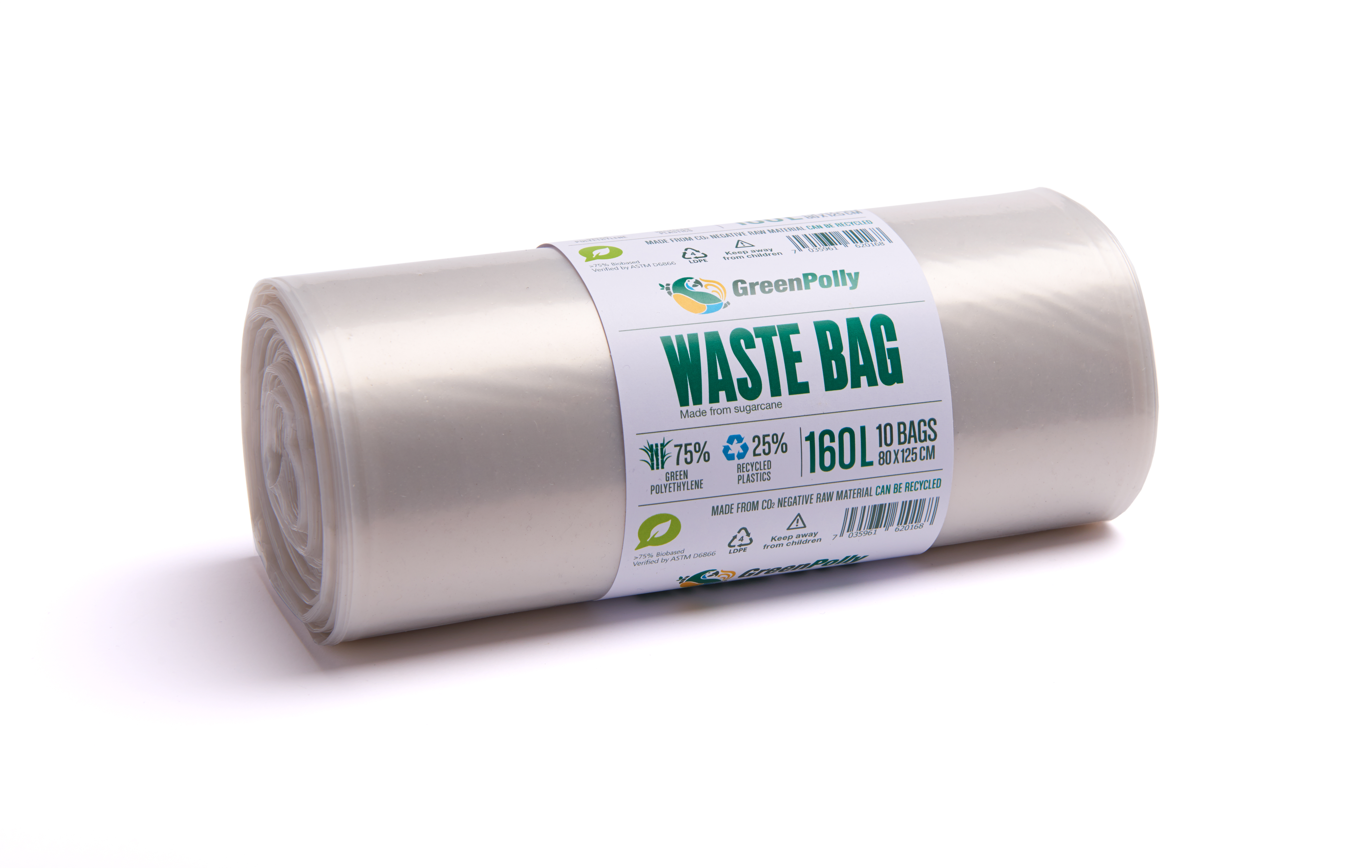 Säckar i grön polyeten som är tillverkade av mer än 75% förnybara råvaror och 25% återvunnen plast. Tillverkas av förnybara råvaror som sockerrör istället för fossila råvaror. Samma egenskaper som traditionell polyeten. Kan återvinnas.