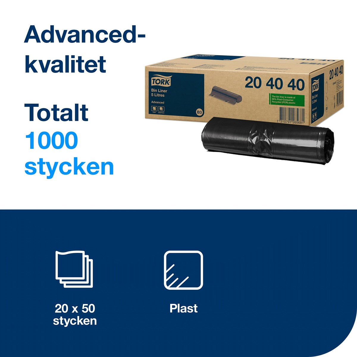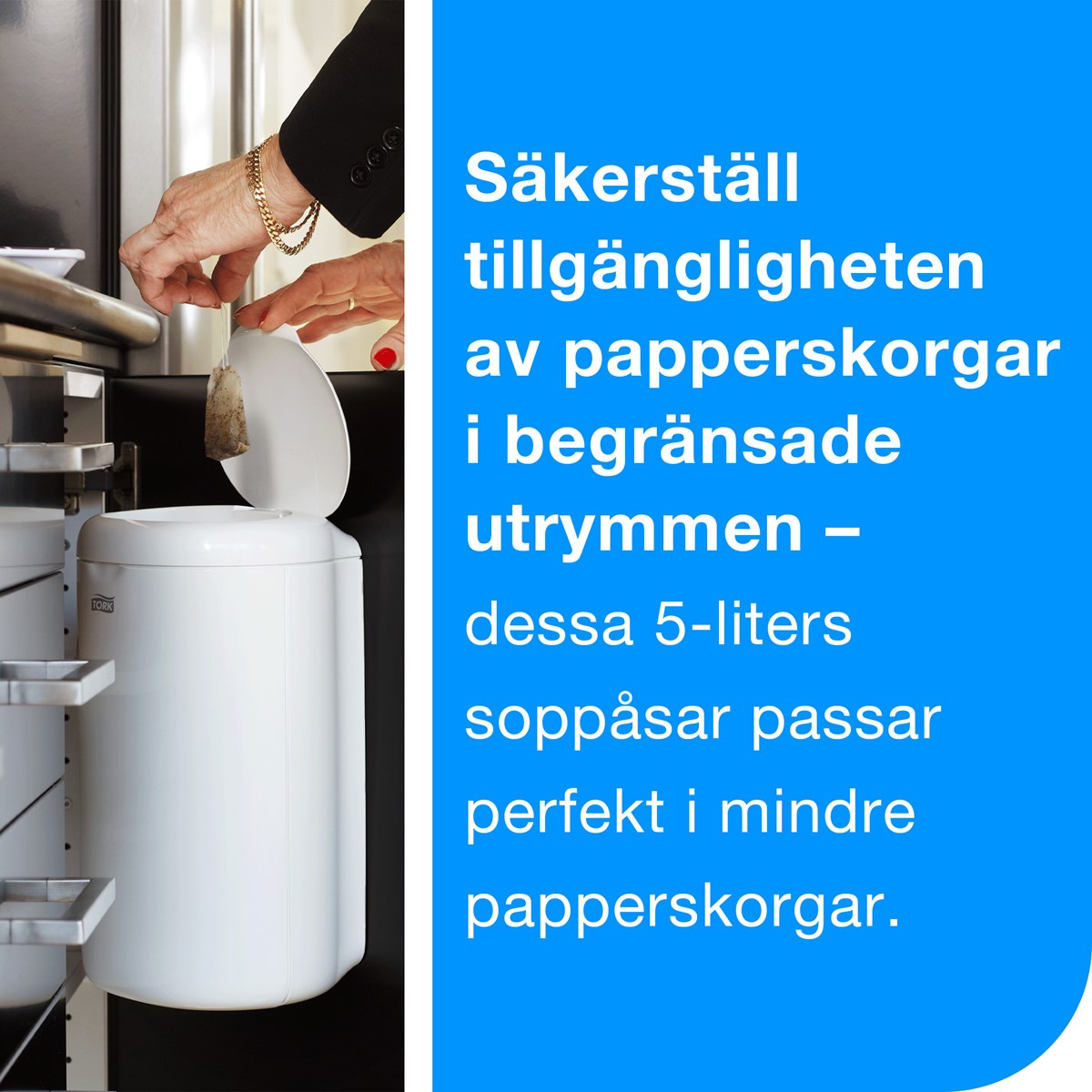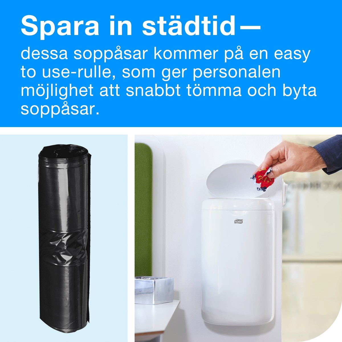 Håll papperskorgar i alla utrymmen snygga och maximera hygienen med Tork 5-liters soppåsar. Personalen kan snabbt tömma och fylla på avfalls- och förvaringskärl med våra lättanvända rullar, vilket säkerställer att underhålls- och städrutiner fungerar smidigt. Kilförseglingsfunktionen minskar också risken för revor och spill vid avfallshantering. Du gör även ett hållbart val genom att välja en soppåse som är gjord av 55 % återvunnet material.