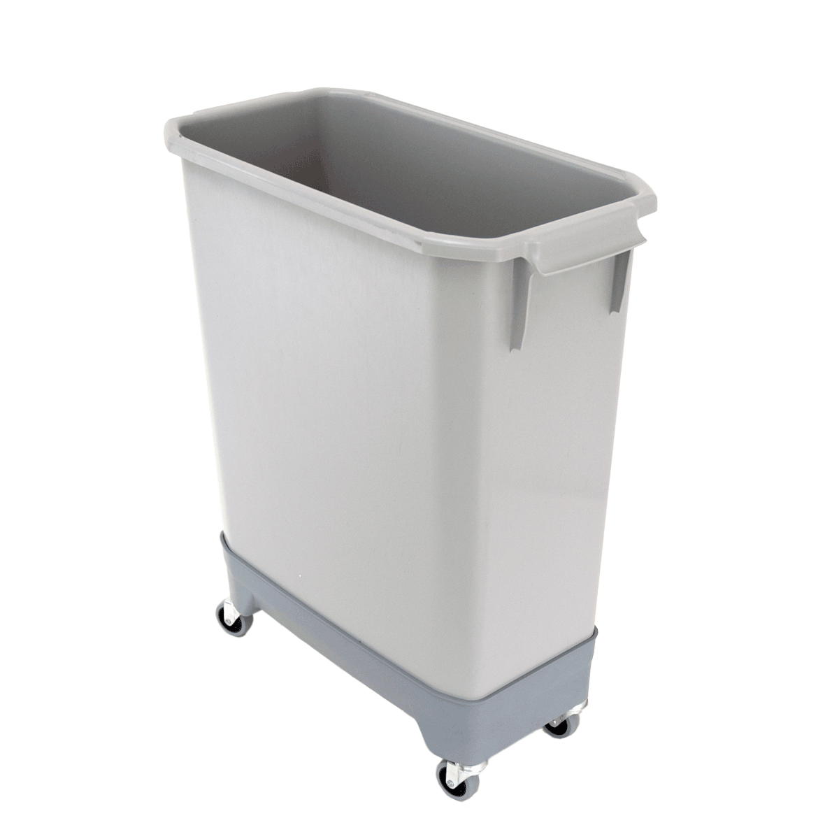 Vagn till 60 L plastkärl i formgjuten grå plast. Vagnen har 50 mm gummihjul. Vagnen går att koppla ihop med andra med hjälp av art.nr 53053. Avståndet mellan golv och botten på vagnen är 76 mm.