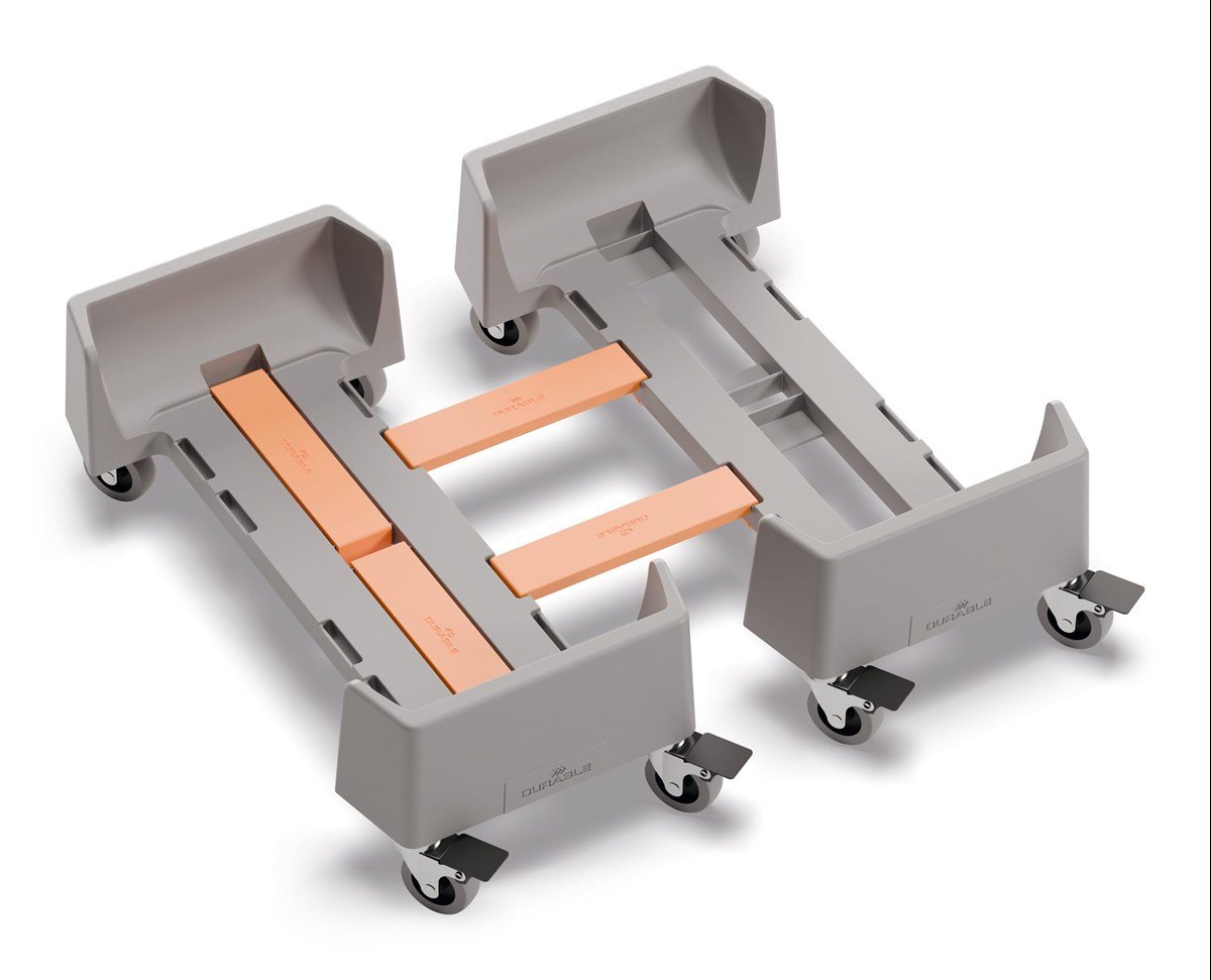 Själva bottenplattan är tillverkad av 100% återvunnen polypropylenplast, vilket gör att produkten inkl. hjul totalt sett är tillverkad av 50% återvunnet material. Detta går i linje med DURABLEs hållbarhetsstrategi RETHINK som fokuserar på att minimera miljöpåverkan genom att designa produkter som är funktionella och hållbara samt tillverkade med omtanke om resurser och återanvändning. Tål fukt, vilket underlättar vid rengöring. Länkhjulen har en diameter på 50 mm och två av dem har broms. Belastningsbar upp till 80 kg. Mått inkl. hjul: 240 x 165 x 495 mm (BxHxD).