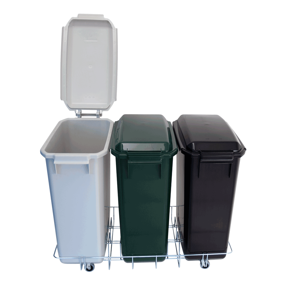 Vagn till 3x60 L kärl i zinkad metall. Vagnen är staplingsbar med rejäla hjulfästen.