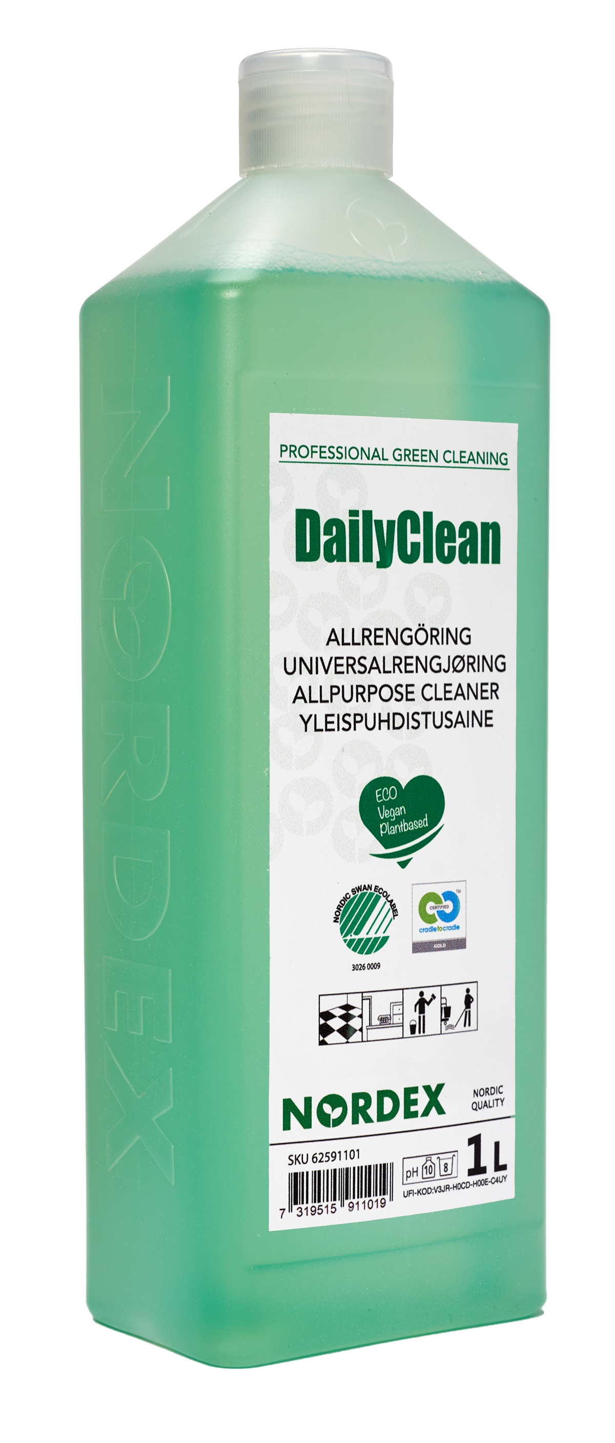 Nordex Green är en serie Cradle to Cradle certifierade rengöringsmedel som har en minimal påverkan på miljön under hela livscykel. Baserade på ingredienser som är biologiskt nedbrytbara och mestadels växtbaserade. Cradle to Cradle står för ett nytt koncept med ett omfattande program för designen av produkter med avseende på användning av material och tillverkning. Programmet utvärderar en produkts säkerhet för människor, miljön och designen för framtida livscykler. Samt fokuserar på att använda säkra material som kan återvinnas som tekniska näringsämnen eller komposteras som biologiska näringsämnen.
