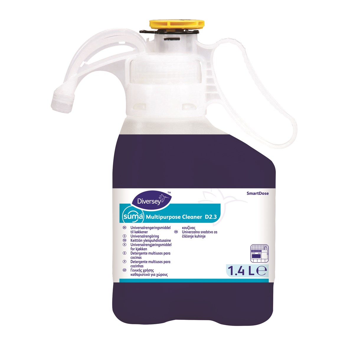 Suma Multipurpose Cleaner D2.3 är ett högkoncentrerat multirengöringsmedel för rengöring av alla vattentåliga ytor i kök. Produkten är mycket effektiv att lösa fett och fasttorkad mat. Formulerad för att kunna utföra fyra olika uppgifter i köket: Allmän rengöring, golvrengöring, handdisk samt glasputs.