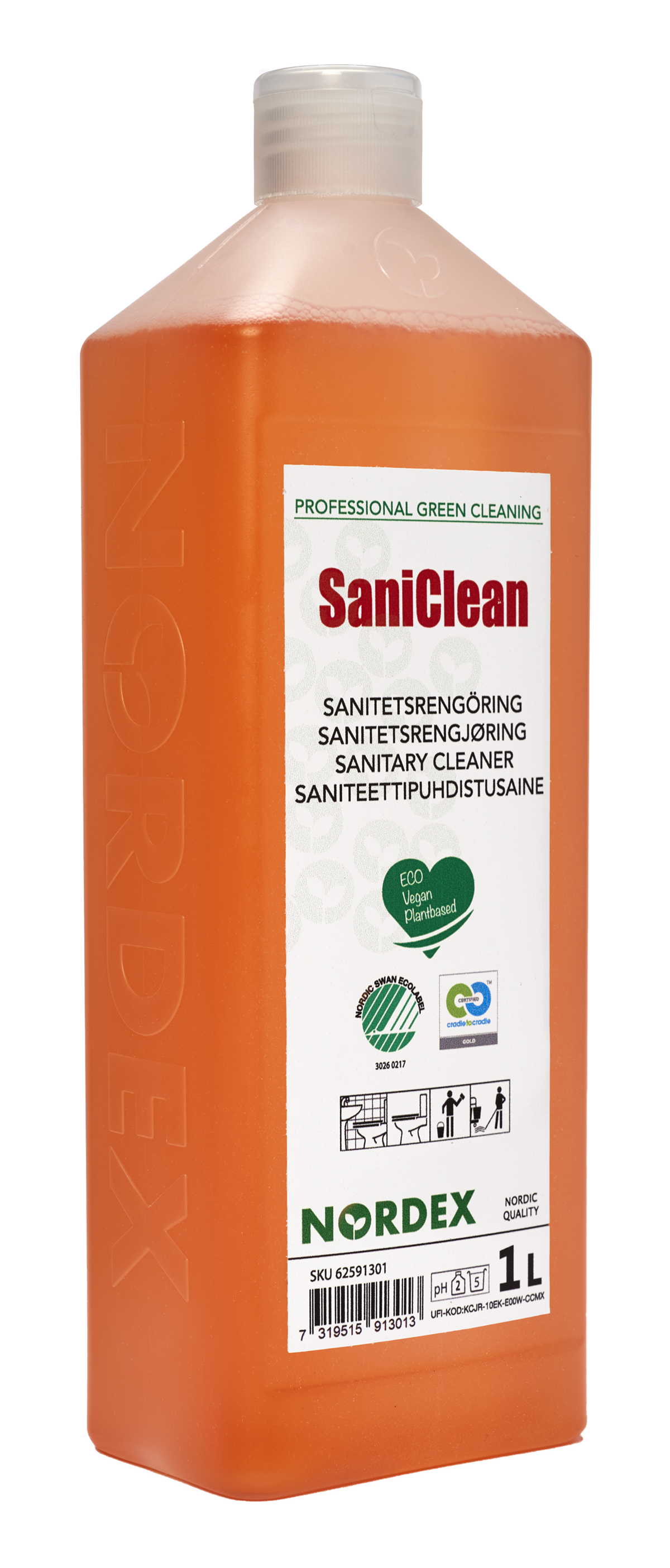 SaniClean är ett koncentrerat surt rengöringsmedel för en daglig cirkulär städning inom sanitetsområdet med kraftfull rengörings- och avkalkningsfunktion för användning i tvättrum, duschar, toaletter och urinoarer som enkelt tar bort all smuts från vattentåliga ytor. Angenämt parfymerad.