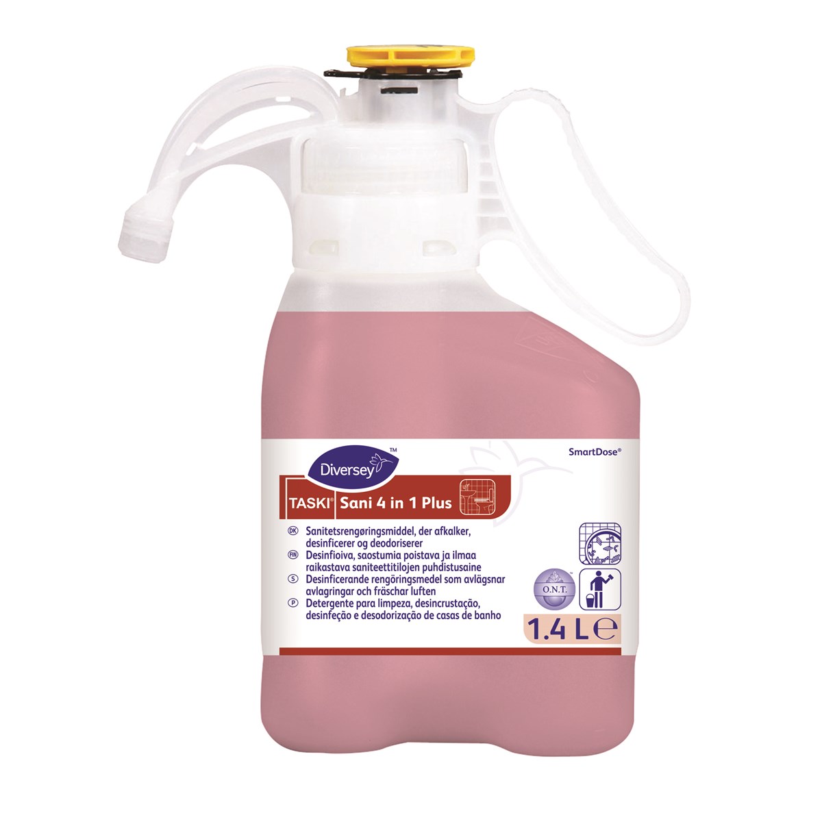 Sani 4 in 1 Plus är ett sanitetsrengöringsmedel som rengör, avkalkar, desinficerar och fräschar luften på alla syratåliga hårda ytor.