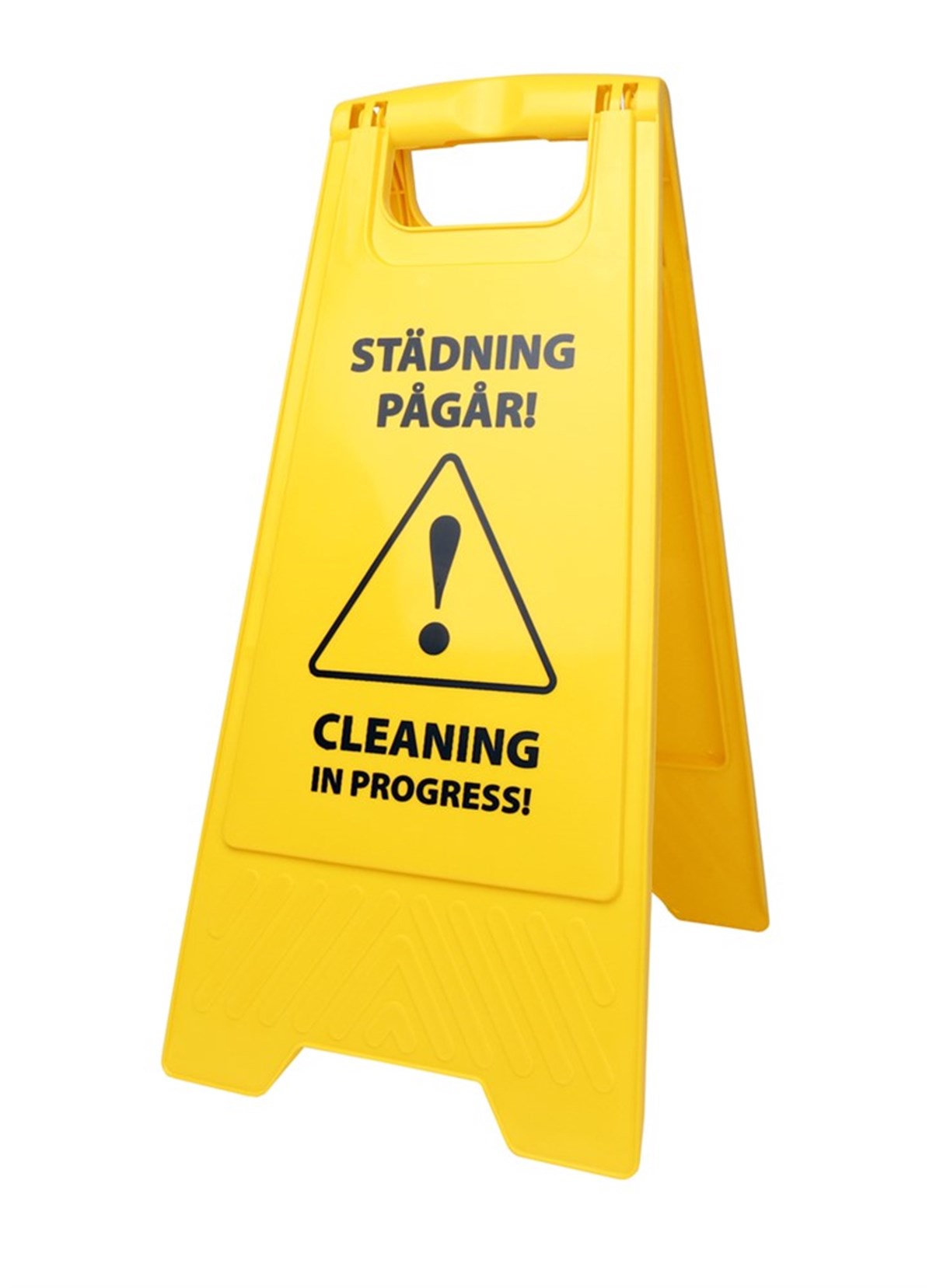 Två sidor: Våta golv och Städning pågår. För avspärrning av områden vid till exempel golvvård eller slaskigt väder.