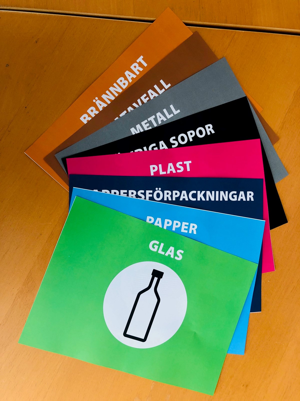 Skyltar i A5-format för källsortering.