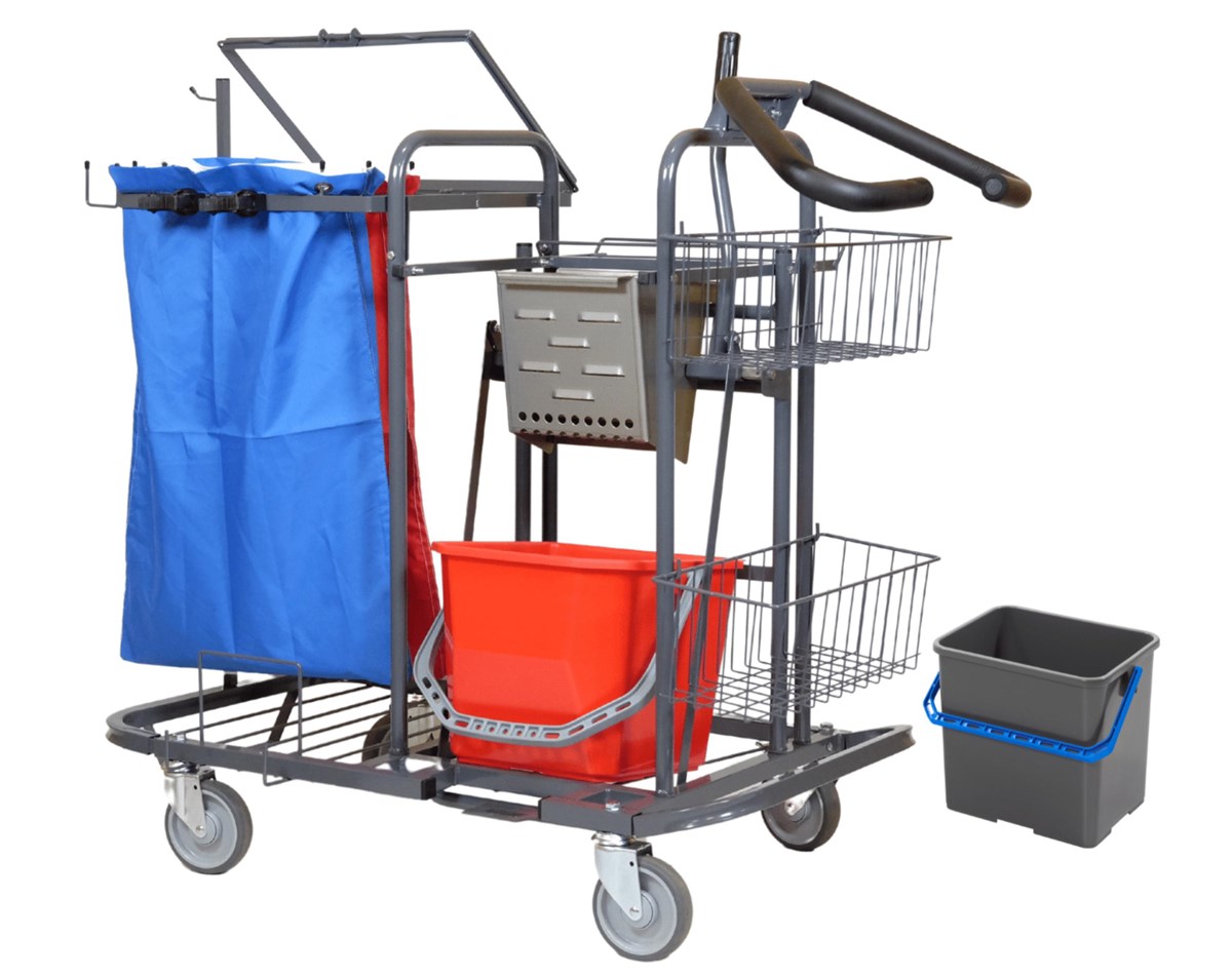 Vagnen är av hög kvalitet, robust och ergonomiskt utformad för moderna städmetoder. Komplett med 3 st korgar, tröskelkrypare, rostfri press, 15 l hink, 6 l hink, sopsetshållare, 2 st tvättsäckar och 2 st tvättnät. Mått: L 930 mm, B 580 mm, H 1090 mm. Vagnen bygger på flexibla lösningar som tillsammans ska underlätta det dagliga arbetet. Bland annat har vi utrustat vagnarna med ett greppvänligt, varmt och mjukt handtag som ger stora möjligheter till varierad körställning. Ställbart handtag i två lägen. Pressvagnen är utrustad med en stadig rostfri press i bekväm arbetshöjd, hand- och/eller fotmanövrerad. Övrig utrustning är rymliga korgar, sopsäckshållare, skafthållare och tröskelkrypare. S2-Pressvagn har en tröskelkrypare som är ergonomisk och lätt att använda. Med dom lättkörda tysta hjulen så styr Du vagnen ergonomiskt och lätt i ditt dagliga arbete