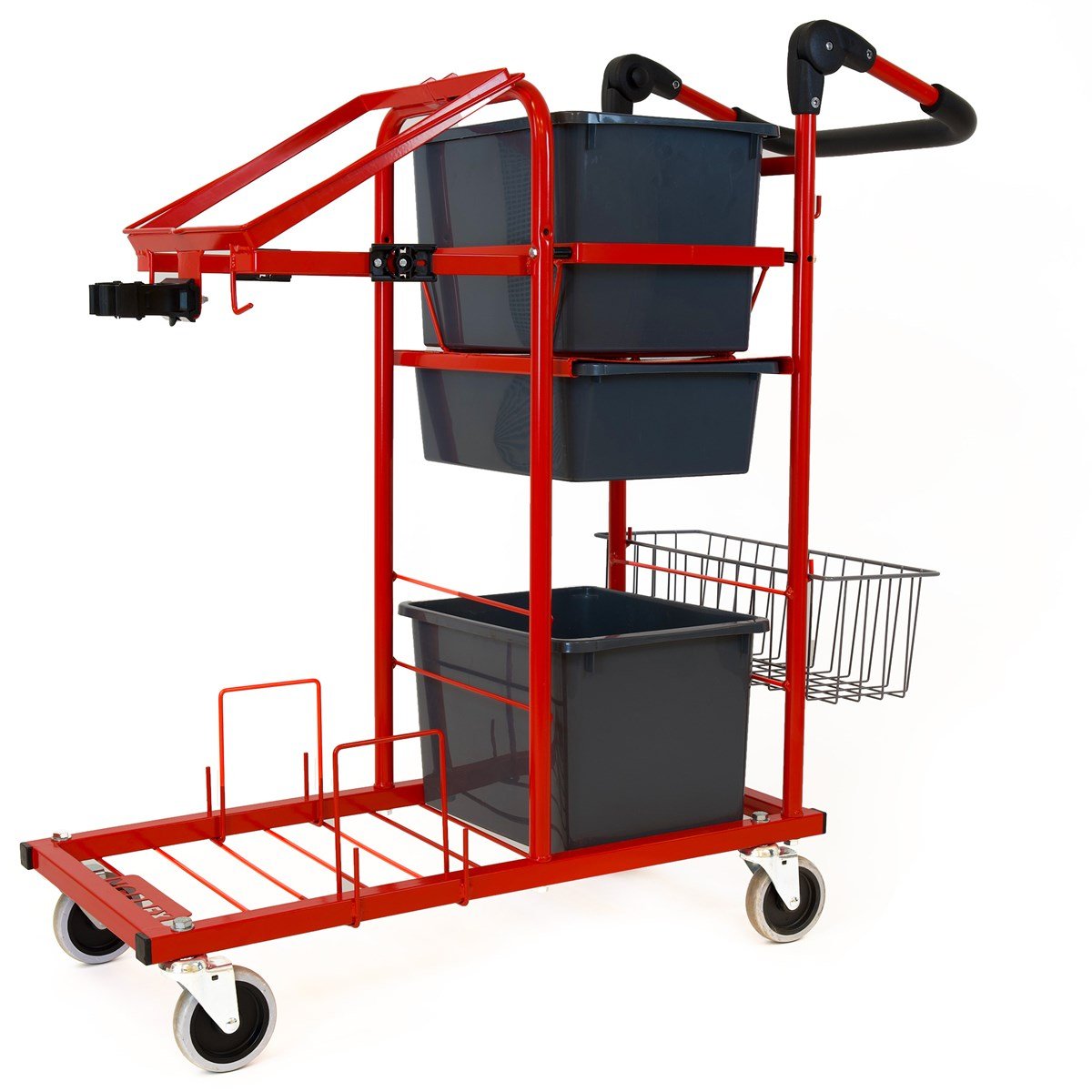 Komplett med 2 st stora plastlådor (20 l), 1 st mindre plastlåda (10 l), 1 st korg Mellan med två placeringsalternativ, krokar för moppsäck, 1 st hållare för sopsäck, 2 st stöd för moppstativ och 1 st Toolflex One-hållare för ex. golvmopp, samt 2 st Toolflex One adaptrar för valfria Toolflex One-tillbehör (säljs separat). 4 st 100 mm hjul varav ett bromsat. Mått LxBxH: 95x38x101 cm. Vikt 13,95 kg.