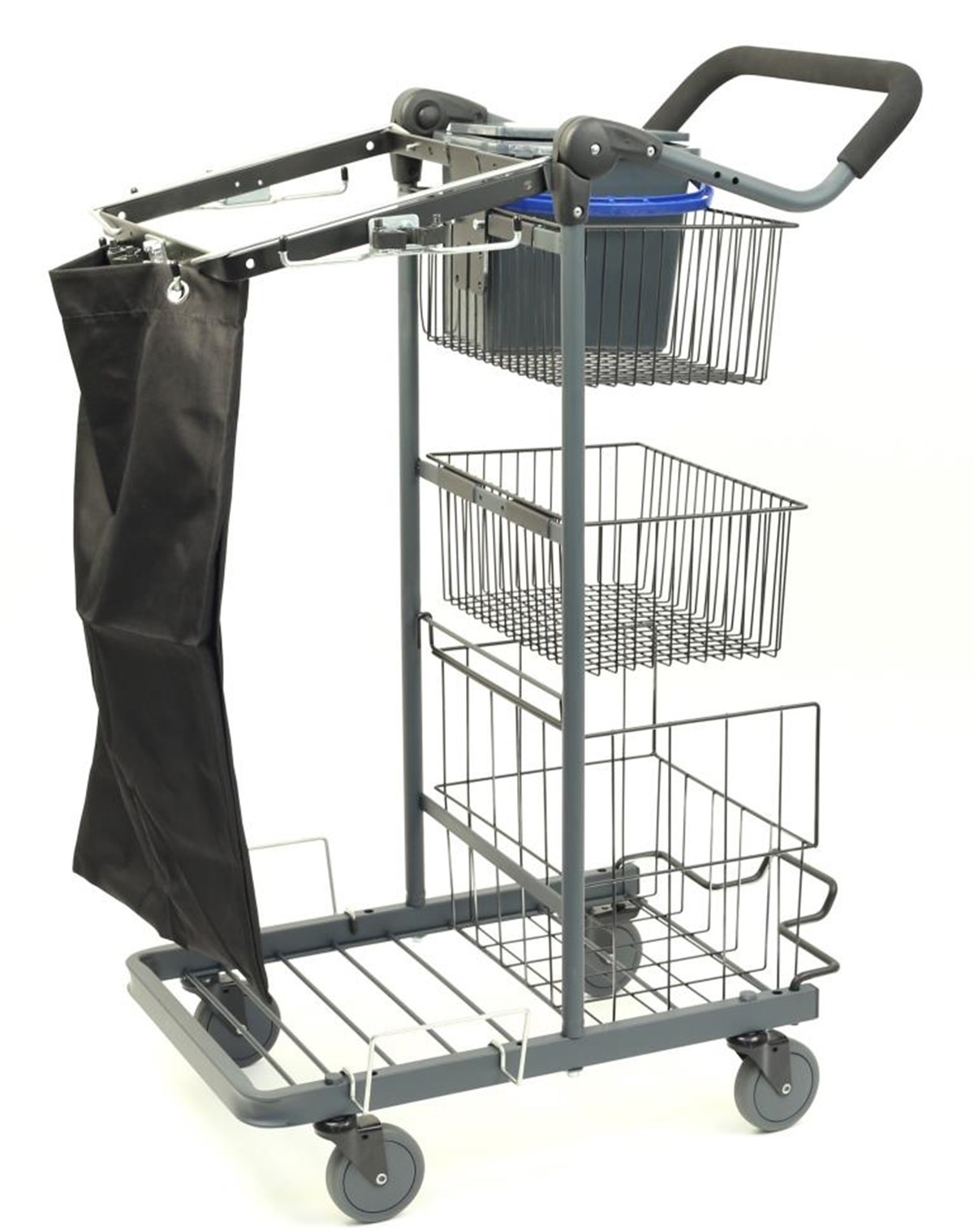Mångsidig Städvagn med bra lastkapacitet. Vagnen har tre våningar och en lastvolym på ca 80 L med stor tvättpåse (30L), 4 krokar, 2 redskapshållare, ställbart handtag, 6 L hink med vipplock, tröskelklättrare och en trendig färgsättning.