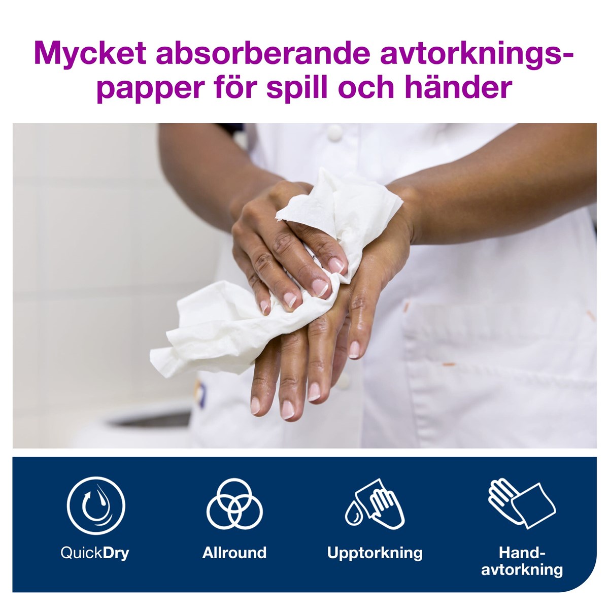 Ett 2-lagerspapper med god absorptionsförmåga som passar perfekt för att torka upp vätskor och torka händerna. Pappret kan användas i Tork W4-dispenser som skyddar det mot smuts och matar ut ett papper i taget för att minska förbrukning och avfall.