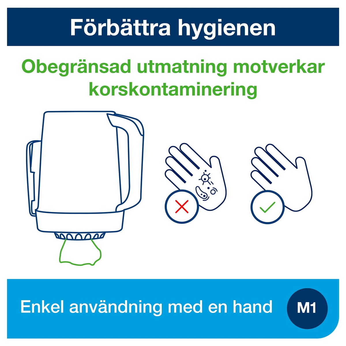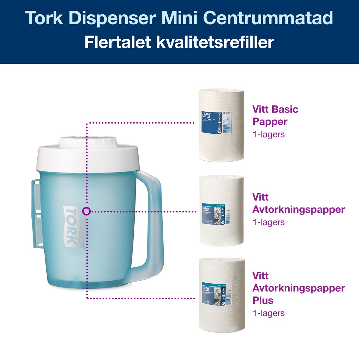 En kompakt lösning för arbetsmiljöer där rengöring av både händer och ytor krävs. Torka av ytor snabbt tack vare den obegränsade utmatningsfunktionen som ger användaren möjlighet att ta så mycket som behövs. Tork Performance är nästa generation av dispensrar för avtorkning i arbetsmiljöer. Rätt kombination av dispensrar och avtorkningspapper ökar produktiviteten och minskar samtidigt de totala förbrukningskostnaderna. Höjd 26,3 cm, bredd 18,5 cm. Vit/turkos.