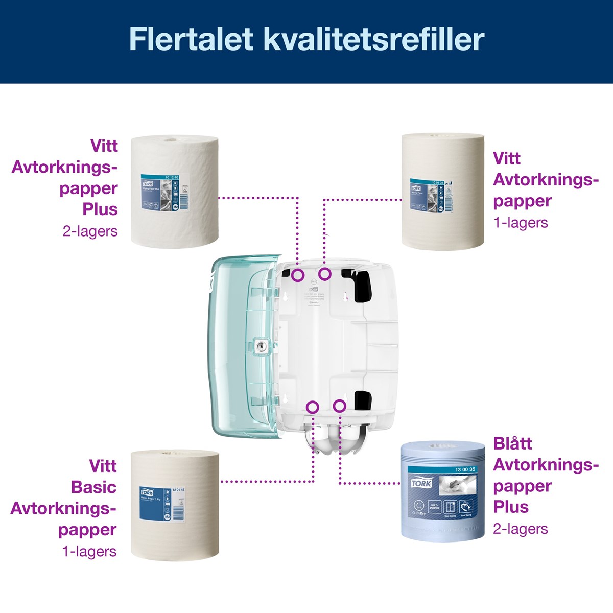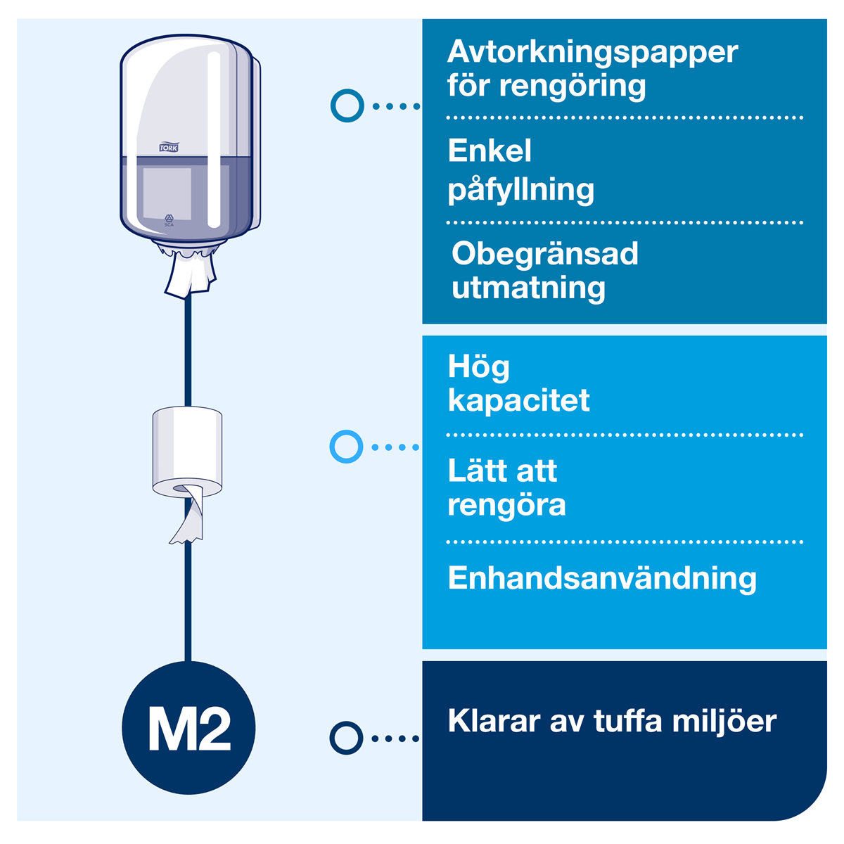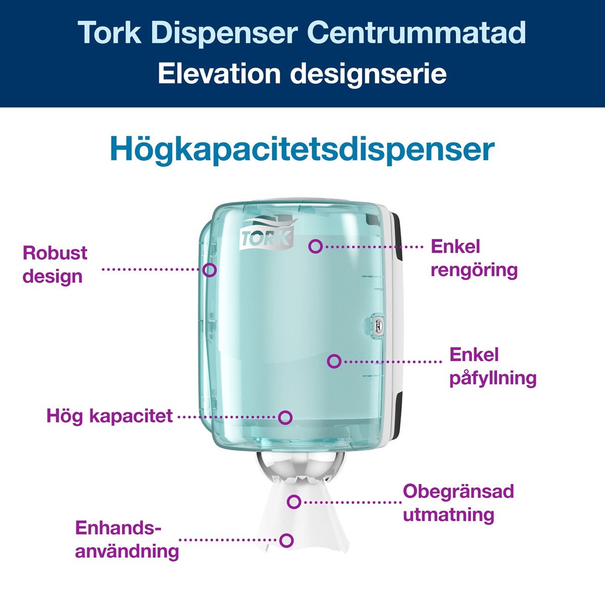 Spill är oundvikligt i ett kök eller annan arbetsplats med högt tempo, vilket betyder att hand- och ytavtorkning är essentiellt. Spara din personal tid vid rengöring med Tork Dispenser Centrummatad. Enhandsutmatning innebär enkelt ytavtorkning, medan ett obegränsat flöde tillåter användare att ta så många papper som behövs. Den centrummatade dispenserns höga kapacitet och performance-design leder till färre och enklare påfyllningar, vilket ökar produktivitet och kostnadseffektivitet.