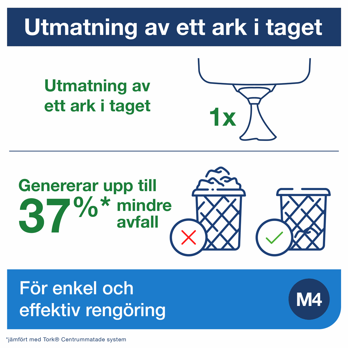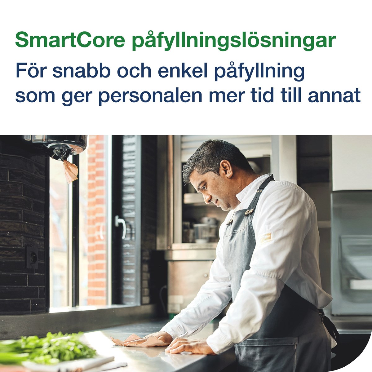 Mångsidig design för vätskor och handtorkning Bidrar till förbättrad hygien då du bara vidrör vid det du tar för dig Godkänd för kontakt med livsmedel Utmatning av ett ark i taget minskar förbrukningen SmartCore® uttagbar hylsa gör påfyllningen enkel
