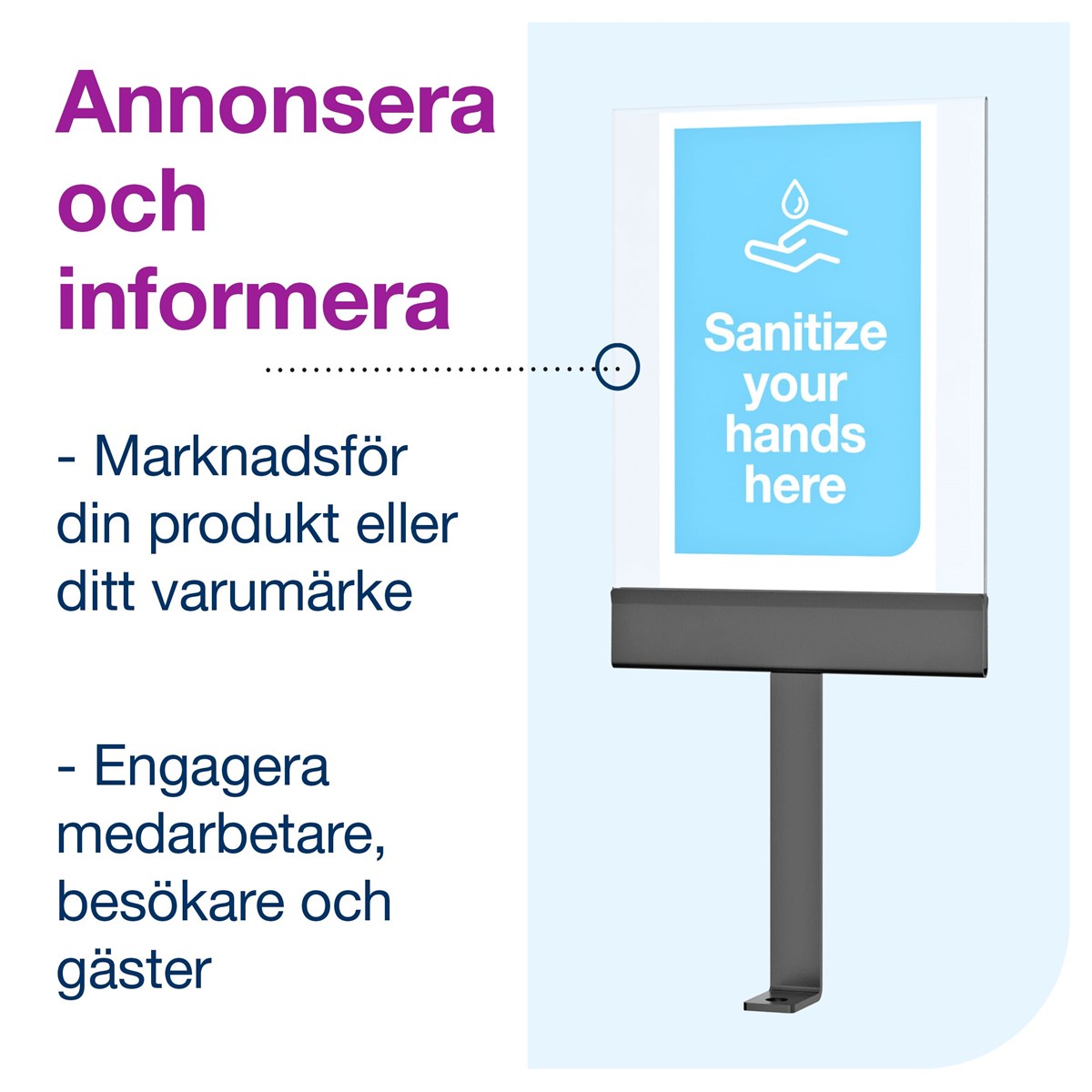 Kommunicera effektivt med gäster och anställda med Toppskylt till Tork Hygienställ. Den är enkel att fästa ovanpå Tork Hygienställ för handdesinfektion. Den fullt anpassningsbara skylten gör att du enkelt kan nå ut med påminnelser om att använda handdesinfektion, viktig hälso- och säkerhetsinformation eller reklam. Du får dessutom tillgång till Tork onlineverktyget som har praktiska och färdiga meddelanden som sparar tid åt dig.Design: Elevation. B 14.8 cm. H 36.4 cm. D 2 cm. Material: Metall/Plast. Färg: Svart. Passar med Tork S1 refiller.