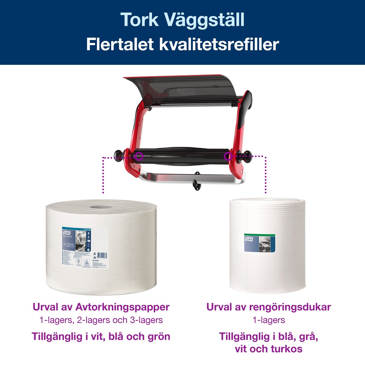 Arbetsplatser med begränsat utrymme kommer att uppskatta Tork Väggställs kompakta storlek. Denna pålitliga lösning monteras på väggen för att hålla ordning även i de trängsta utrymmen. Minska underhållet med hjälp av denna dispenser från Performance designserien. Den har en hög kapacitet och en enkel funktion som gör påfyllningen snabb och effektiv, vilket ökar produktiviteten och är kostnadseffektivt. Multitasking är dessutom möjligt – ta avtorkningspapper och rengöringsdukar med bara en hand.Design: Performance. B 64.6 cm. H 46.3 cm. D 27.4 cm. Material: Metall/Plast. Färg: Röd/Smoke. Passar med Tork W1 refiller.
