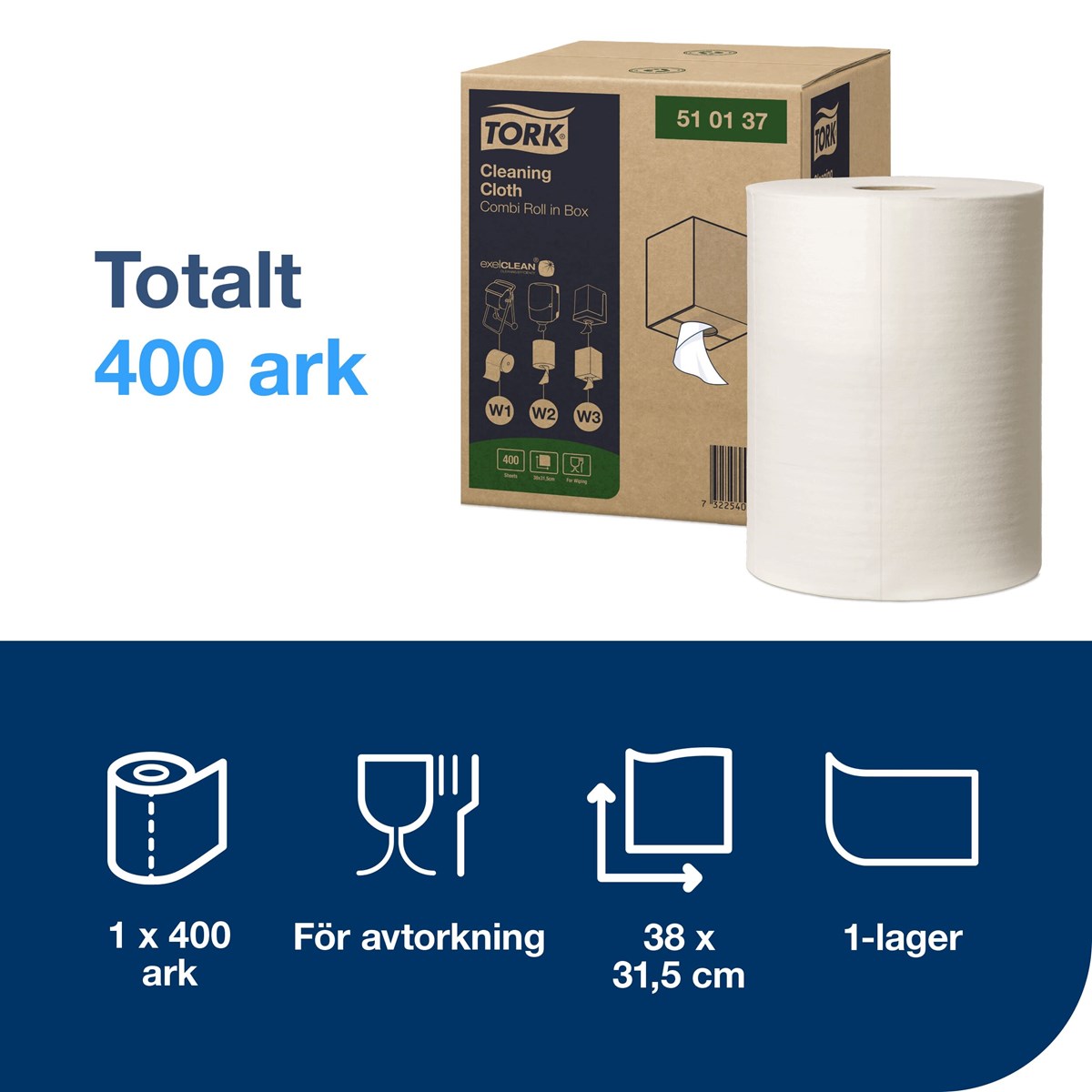 Mjuk vit W1/2/3: Att byta trasor inför varje uppgift är ineffektivt. Tork Rengöringsduk gör livet enklare och kan användas med de flesta lösnings- desinfektions- och rengöringsmedel. Dukarna är slitstarka och absorberar snabbt upp vätskor och oljor, och de kan användas upprepade gånger för ökad effektivitet. Använd med Tork Dispenser Maxi Centrummatad eller Tork Dispenser Rulle i Box, som går att använda med en hand. De kan även användas med Tork Golv- och Väggställ som tagits fram för att spara utrymme på arbetsplatsen.1 rulle , med 400 dukar vardera. 1-lagers. Premium-kvalitet. Storlek på rulle: D 152 m, B 32 cm. Arkets längd: 38 cm. Hylsa inre diameter: 7.13 cm. Passar med W2 dispensrar.