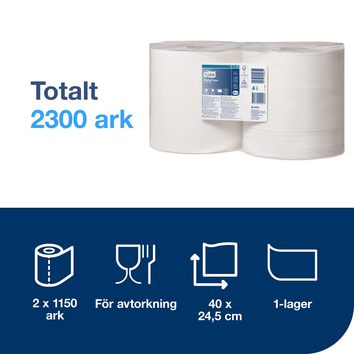 Tork Avtorkningspapper i allroundkvalitet hanterar effektivt både enklare städuppgifter och avtorkning av händer i arbetsmiljöer. Undvik ränder och ludd – papprets praktiska struktur är perfekt vid avtorkning av svårhanterliga glasytor. Använd med Tork Golv- eller Väggställ för säker användning, eller med Tork Dispenser Maxi Centrummatad som gör det möjligt att effektivt riva av papper med en hand. Denna rulle har en hög kapacitet och varar längre, vilket minskar tiden vid påfyllning och ökar produktiviteten.2 rullar, med 1150 dukar vardera. 1-lagers. Advanced-kvalitet. Storlek på rulle: D 460 m, B 24.5 cm. Arkets längd: 40 cm. Hylsa inre diameter: 7.1 cm. Passar med W2 dispensrar.