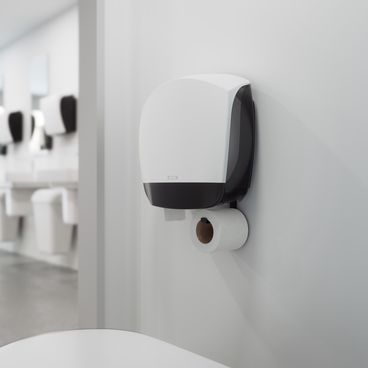 Toalettdispenser för jumborullar Optimalt utnyttjande - hela rullen används tack vare en integrerad restrullefunktion Enkel pappersavrivning på alla sidor och kanter